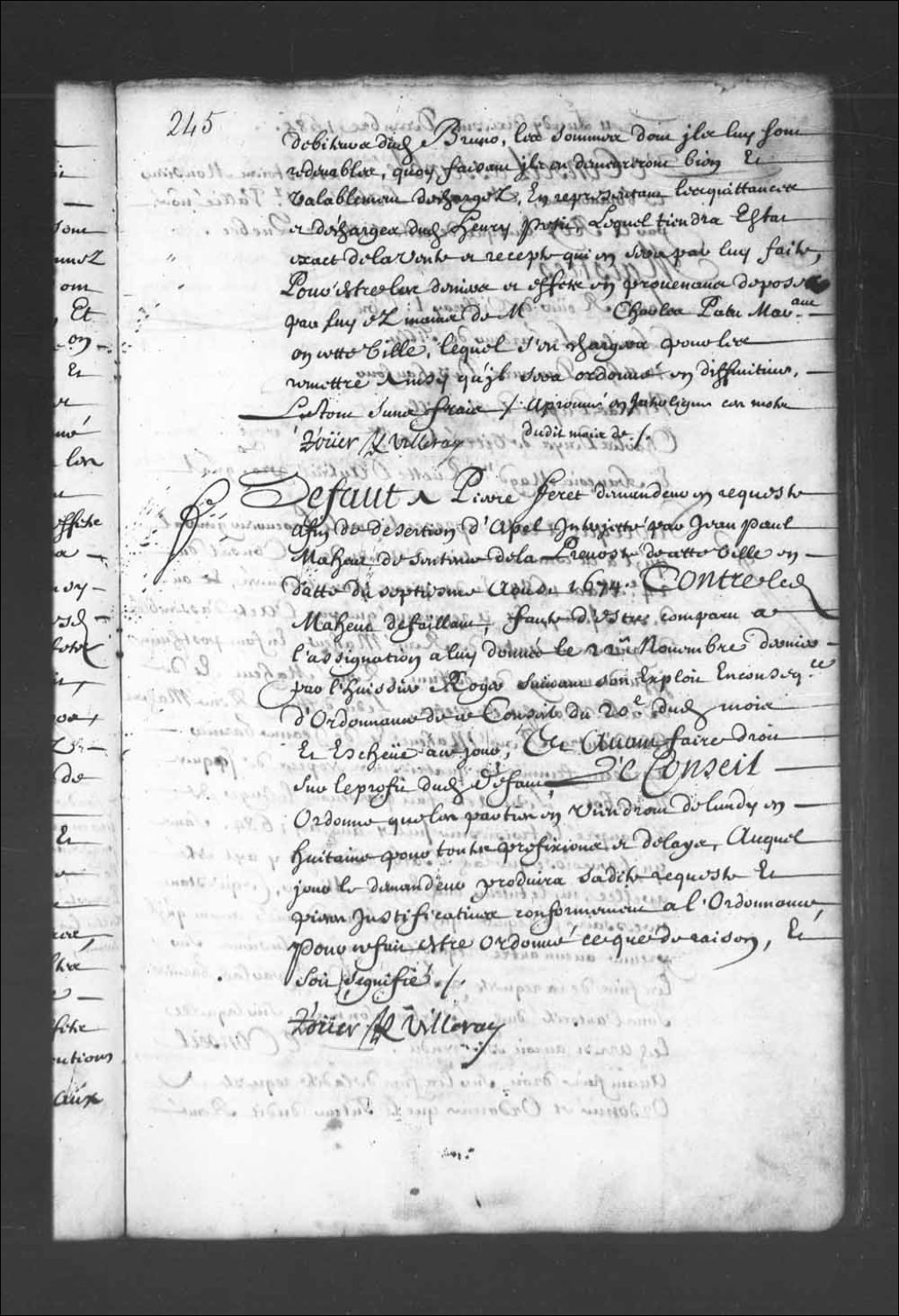 Transcription du texte avec orthographe modernisée : «Défaut à Pierre feret demandeur en requête afin de désertion d'appel interjeté par Jean-Paul Maheut de sentence de la prévôté de cette ville en date du septième août 1674. CONTRE ledit Maheut défaillant, faute d'être comparu à l'assignation à lui donnée le 22e novembre dernier par l'huissier Roger suivant son exploit en conséquence d'ordonnance de ce Conseil du 20e dudit mois et échue à ce jour, et avant faire droit sur le profit dudit défaut, le Conseil ordonne que les parties en viendront de lundi en huitaine pour toutes préfixions et délais, auquel jour le demandeur produira sa dite requête et pièces justificatives conformément à l'ordonnance, pour ce fait être ordonné ce que de raison, et soit signifié. ROUER DE VILLERAY.»
