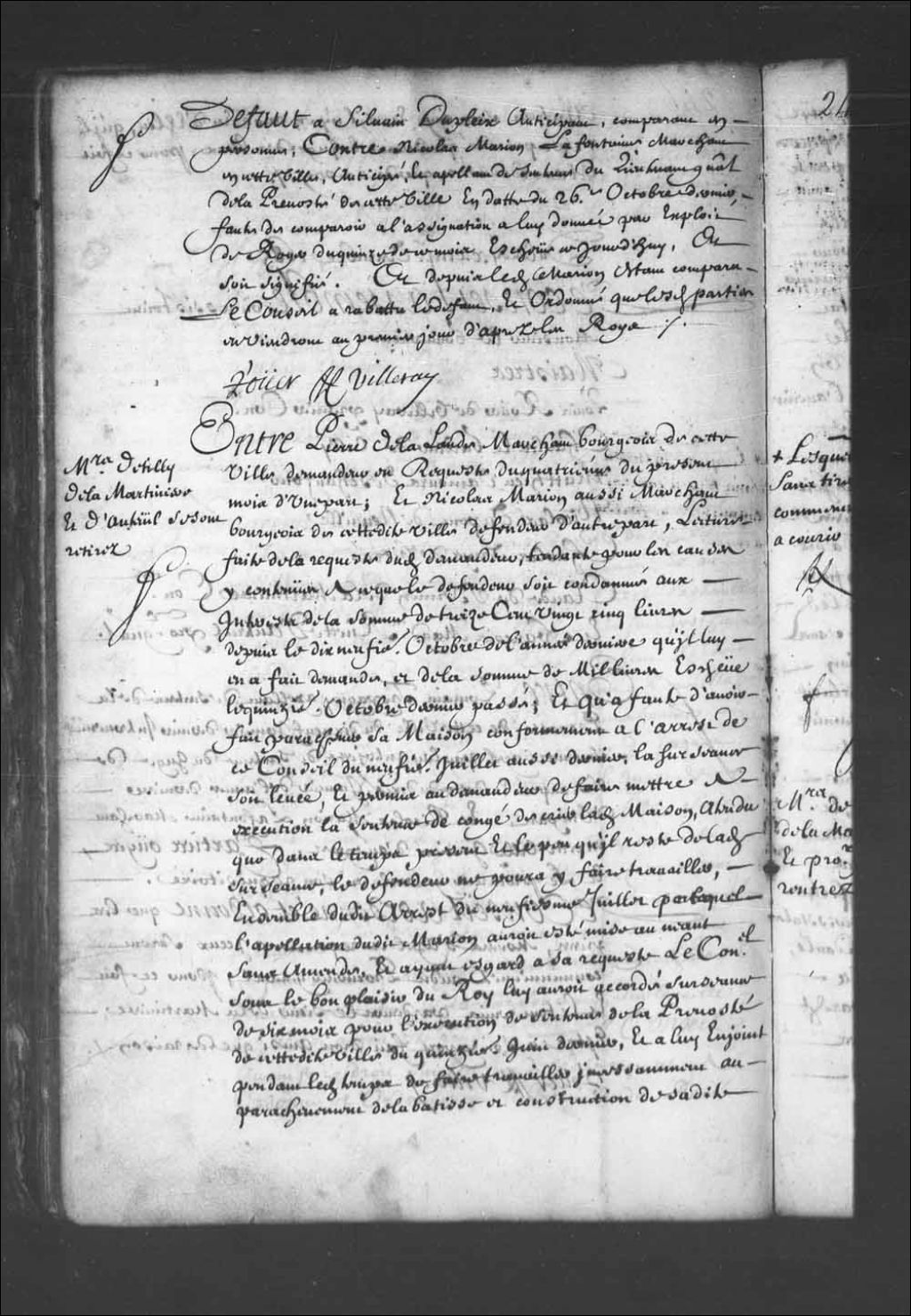 Défaut en faveur de Sylvain Duplais contre Nicolas Marion Lafontaine, marchand de Québec; le dit Marion étant comparu, le Conseil a rabattu le dit défaut et ordonne que les parties en viendront au premier jour après la fête des rois, 24 décembre 1685, Archives nationales à Québec, Fonds Conseil souverain, (03Q,TP1,S28,P3446).