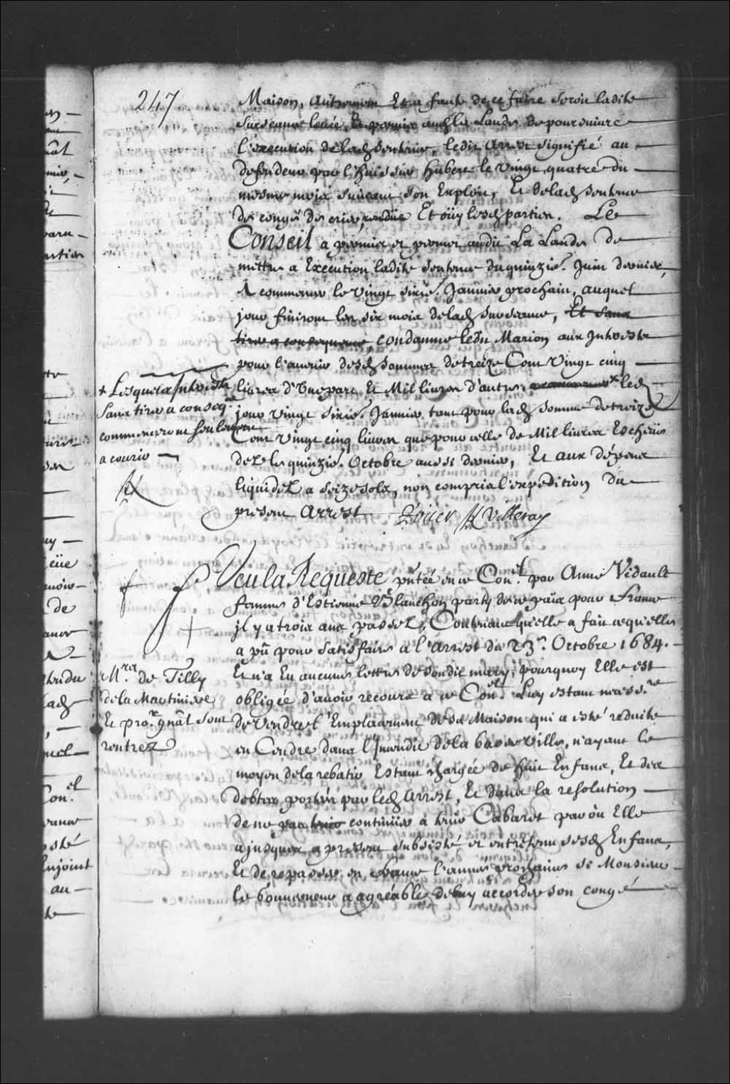 - Transcription du texte avec orthographe modernisée : «Messieurs de Tilly de la Martinière et procureur général sont rentrés. Vu la requête présentée en ce Conseil par Anne Vidault femme de Etienne Blanchon parti de ce pays pour France il y a trois ans passés, contenant qu'elle a fait ce qu'elle a pu pour satisfaire à l'arrêt du 23e octobre 1684. Et n'a eu aucune lettre de sondit mari, pour quoi elle est obligée d'avoir recours à ce Conseil lui étant nécessaire de vendre l'emplacement de sa maison qui a été réduite en cendre dans l'incendie de la basse-ville, n'ayant le moyen de la rebâtir étant chargée de huit enfant, et des dettes portées par ledit arrêt, et dans la résolution de ne pas continuer à tenir cabaret par où elle a jusqu'à présent subsisté et entretenu sesdits enfants, et de repasser en France l'année prochaine si Monsieur le gouverneur a agréable de lui accorder son congé et à sesdits enfants, n'ayant de quoi subsister en [...]