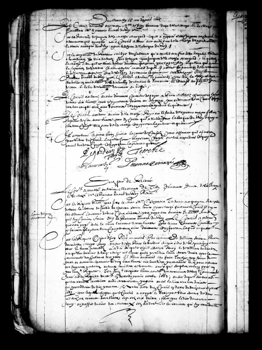 Transcription du texte avec orthographe modernisée : «Le Conseil a ordonné au sieur Damours conseiller de payer à Pierre Melenne charpentier la somme de trente-six livres pour réparations faites au magasin par ordonnance de ce Conseil de quoi sera tenu compte audit sieur Damours rapportant la présente et quittance.»