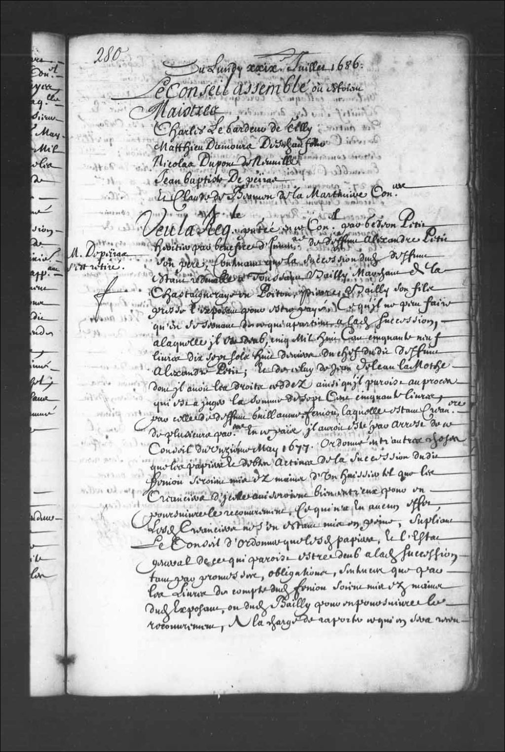 - Transcription du texte avec orthographe modernisée : «Du lundi 29 juillet 1686. Le Conseil assemblé où étaient maîtres Charles LeGardeur de Tilly. Mathieu Damours Deschaufour. Nicolas Dupont de Neuville. Jean-Baptiste Depeiras. Et Claude de Bermen de la Martinière conseillers. Monsieur Depeyras s'est retiré. Vu la requête présentée en ce Conseil par Gédéon Petit héritier par bénéfice d'inventaire de défunt Alexandre Petit son père, contenant que la succession dudit défunt étant redevable à Toussaint Bailli marchand de la Chastaigneraie en Poitou, Pierre Bailli son fils presse l'exposant pour être payé, ce qu'il ne peut faire qu'en se servant de ce qui appartient à ladite succession, à laquelle il est dû, cinq mille huit cent cinquante-neuf livres dix-sept sols huit deniers du chef dudit défunt Alexandre Petit; et de celui de Jean Deleau Lamothe dont il avait les droits cédés ainsi qu'il paraît au procès qui est à juger la somme de sept [...]