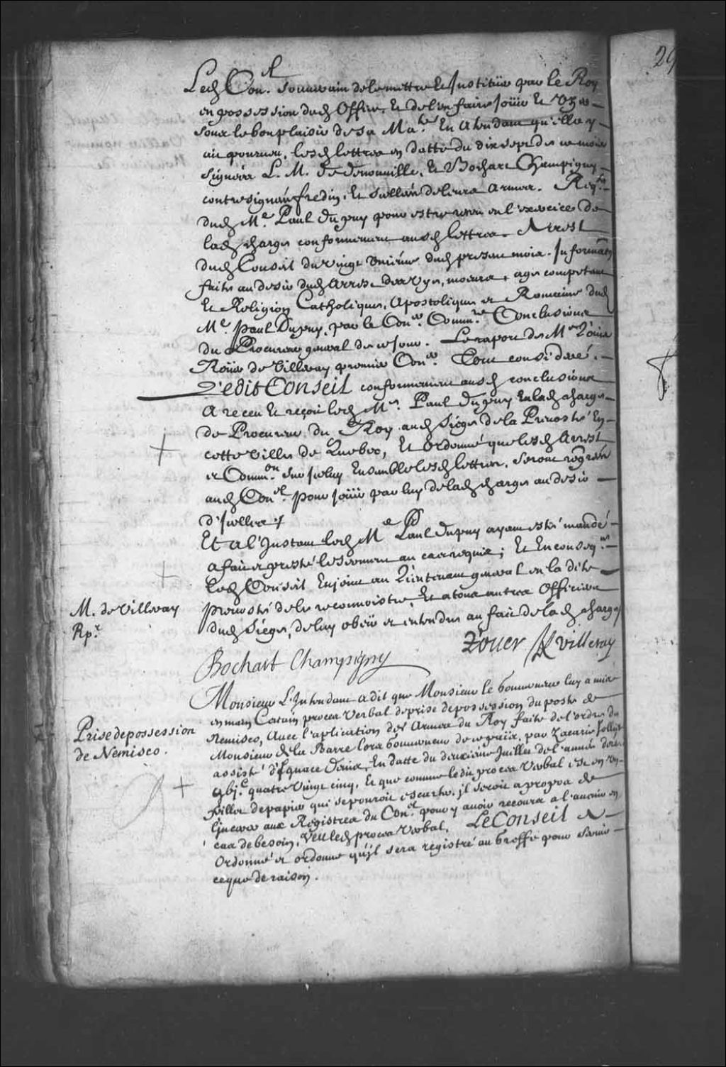 Transcription du texte avec orthographe modernisée : «Prise de possession de Nemisco (Nemiscau). Monsieur l'intendant a dit que Monsieur le gouverneur lui a mis en main certain procès-verbal de prise de possession du poste de Nemisco (Nemiscau), avec l'application des armes du Roi faite de l'ordre de Monsieur de Labarre lors gouverneur de ce pays, par Zacharie Jolliet assisté de Ignace Denis, en date du deuxième juillet de l'année dernière mille six cent quatre-vingt-cinq, et que comme ledit procès-verbal, est en un feuille de papier qui se pourrait écarter, il serait à propos de l'insérer aux registres du Conseil pour y avoir recours à l'avenir en cas de besoin, vu ledit procès-verbal, le Conseil a ordonné et ordonne qu'il sera registré au greffe pour servir ce que de raison.»