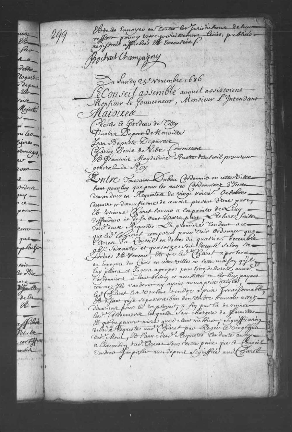 Transcription du texte avec orthographe modernisée : «Du lundi 25e novembre 1686. Le Conseil assemblé auquel assistaient Monsieur le gouverneur, Monsieur l'intendant Maîtres Charles LeGardeur de Tilly. Nicolas Dupont de Neuville. Jean-Baptiste Depeiras. Charles Denys de Vitré conseillers. Et François Madeleine Ruette d'Auteuil procureur général du Roi. Entre Toussaint DUBAU cordonnier en cette ville tant pour lui que pour les autres cordonniers d'icelle demandeur en requête du vingt-troisième octobre dernier et dix-neuvième de ce mois présent d'une part, et Etienne Charet tanneur à la Pointe de Lévy défendeur et défaillant d'autre part, lecture faite desdites deux requêtes. La première tendant à ce que ledit Charet comparus pour voir ordonner que l'arrêt du Conseil en date du quatrième décembre mille six cent soixante-quatorze soit exécuté selon sa forme et teneur, et que ledit Charet apportera ou enverra des cuirs en cette ville en telle maison qu'il lui plaira et jugera à propos pour être délivrés auxdits cordonniers à leur besoin et nécessité en les lui payant comme Ils vaudront n'y ayant aucun prix réglé, ledit Charet les voulant vendre à prix irraisonnable, et disant qu'il se passera bien d'en vendre trouvant assez d'ouvriers pour les employer, a fin par la de ruiner lesdits cordonniers lesquels sont chargés de familles et qui ne peuvent vivre que de leur métier, signification de ladite requête audit Charest par Roger le vingt-huit dudit mois, et l'autre desdites requêtes tendante aussi à l'exécution dudit arrêt sous telle peine que le Conseil voudrait imposer avec dépens signifiée audit Charet par Metru le 23e de ce dit mois, ensemble dudit arrêt ci-dessus daté rendu sur requête desdits cordonniers portant entre autres choses que par provision pour le bien public, ledit Charet apporterait ou enverrait en cette ville en telle maison qu'il jugerait à propos six cuirs entiers pour faire des souliers, six vaches pour empeigner, trois peaux de vaches en fort et une douzaine de peaux de veau sauf ensuite a en régler le prix, avec injonction à lui d'y satisfaire incessamment sous telle peine que de raison, ledit arrêt signifié ledit jour vingt-huit octobre dernier passé, et ouï le procureur général du Roi. Le Conseil a ordonné et ordonne que ledit arrêt du quatre décembre mille six cent soixante-quatorze sera exécuté selon sa forme et teneur, et qu'icelui Charet fournira les cuirs dans huitaine, et qu'ils seront visités, et confisqués s'il se trouve qu'ils ne soient pas bien conditionnés et ledit Charet condamné aux dépens. BOCHART CHAMPIGNY.»