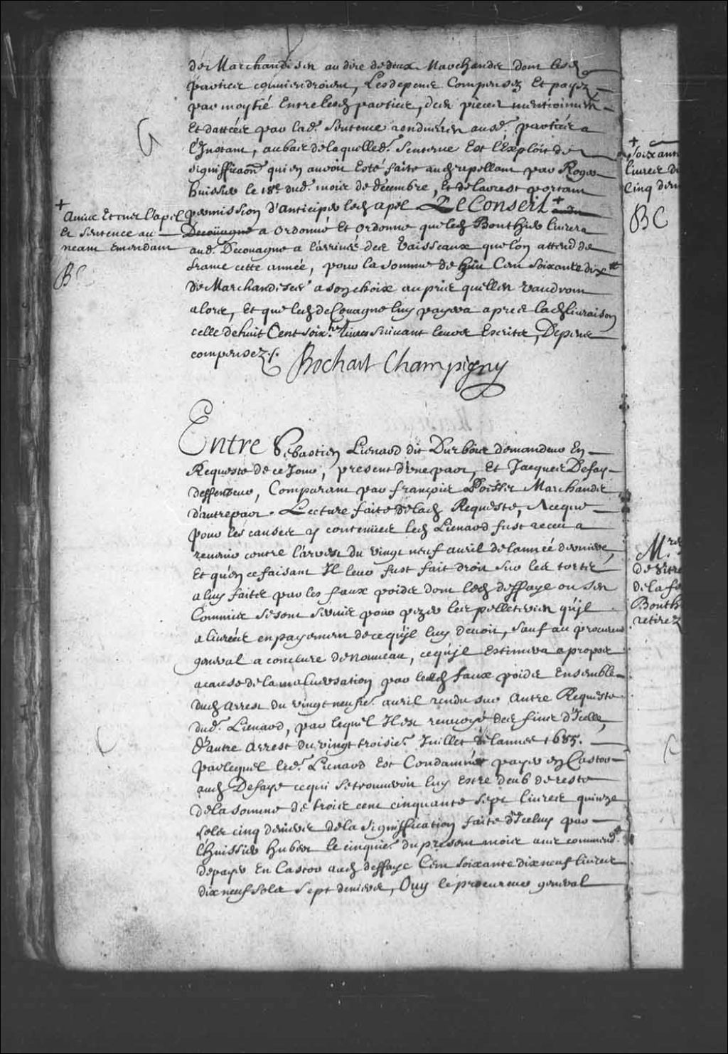 - Transcription du texte avec orthographe modernisée : «Entre Sébastien LIENARD dit DURBOIS demandeur en requête de ce jour, présent d'une part, et Jacques DEFAY défendeur, comparant par François Poisset marchands d'autre part. Lecture faite de ladite requête, à ce que pour les causes y contenues ledit Lienard fut reçu à revenir contre l'arrêt du vingt-neuf avril de l'année dernière. Et qu'en ce faisant il leur fut fait droit sur les torts à lui faits par les faux poids dont ledit Defaye ou ses commis se sont servis pour peser les pelleteries, qu'il a livrées en payement de ce qu'il lui devait, sauf au procureur général à conclure de nouveau ce qu'il estimera à propos à cause de la malversation par lesdits faux poids ensemble dudit arrêt du vingt-neuvième avril rendu sur autre requête dudit Lienard, par lequel il est renvoyé des fins d'icelle, d'autre arrêt du vingt-troisième juillet de l'année 1685 par lequel ledit Lienard est condamné payer en castor audit Defaye ce qui se trouverait lui être dû de reste de la somme de trois cent cinquante-sept livres quinze sols cinq deniers de la signification faite d'icelui par l'huissier Hubert le cinquième du présent mois avec commandement de payer en castor audit Defaye cent soixante-dix-neuf livres dix-neuf sols sept deniers, ouï le procureur général du Roi. Le Conseil a débouté et déboute ledit Lienard des fins de sa dite requête icelui renvoyé à l'exécution dudit arrêt du deuxième juillet, et en ce faisant l'a condamné et condamne payer audit Defaye en castor la somme de cent soixante-dix-neuf livres dix-neuf sols cinq deniers et ledit Defaye à lui rendre quinze livres en argent pour les frais desquels il est condamné par ledit arrêt. BOCHART CHAMPIGNY.»