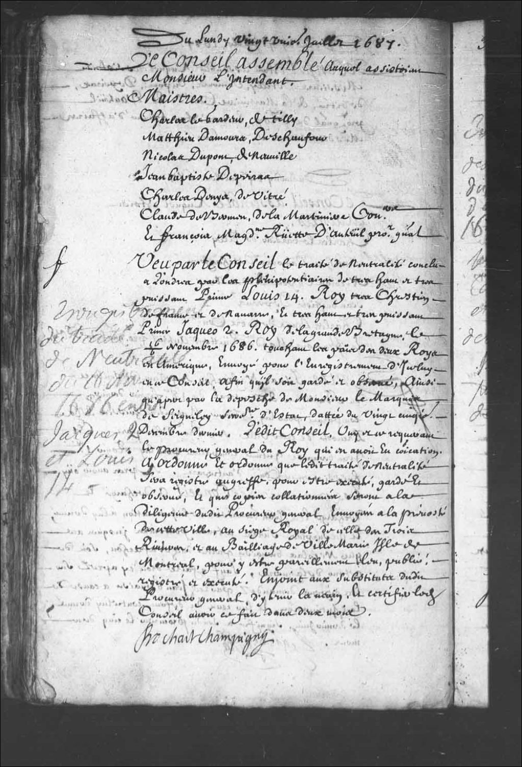 - Transcription du texte avec orthographe modernisée : «Du lundi vingt et unième juillet 1687. Le Conseil assemblé auquel assistaient Monsieur l'intendant. Maîtres Charles LeGardeur, de Tilly. Mathieu Damours, Deschaufour. Nicolas Dupont, de Neuville. Jean-Baptiste Depeiras. Charles Denys de Vitré. Claude de Bermen de la Martinière conseillers. Et François Madeleine Ruette d'Auteuil procureur général. Vu par le Conseil le traité de neutralité conclu à Londres par les plénipotentiaires de très haut et très puissant prince Louis 14 Roi très chrétien de France et de Navarre, et très haut et très puissant prince Jacques 2 Roi de la Grande-Bretagne, le 16-6 novembre 1686 touchant les pays des deux rois en Amérique, envoyé pour l'enregistrement d'icelui en ce Conseil, afin qu'il soit gardé et observé, ainsi qu'appert par la dépêche de Monsieur le marquis de Seigneley secrétaire d'état, datée du vingt-cinquième décembre dernier. Ledit Conseil, ouï et ce requérant le procureur général du Roi qui en avait eu communication a ordonné et ordonne que ledit traité de neutralité sera registré au greffe, pour être exécuté, gardé et observé, et que copies collationnées seront à la diligence dudit procureur général envoyées à la prévôté de cette ville, au siège royal de celle des Trois-Rivières, et au bailliage de Ville-Marie île de Montréal, pour y être pareillement lu, publié, registré et exécuté. enjoint aux substituts dudit procureur général, d'y tenir la main, et certifier ledit Conseil avoir ce fait dans deux mois. BOCHART CHAMPIGNY.»