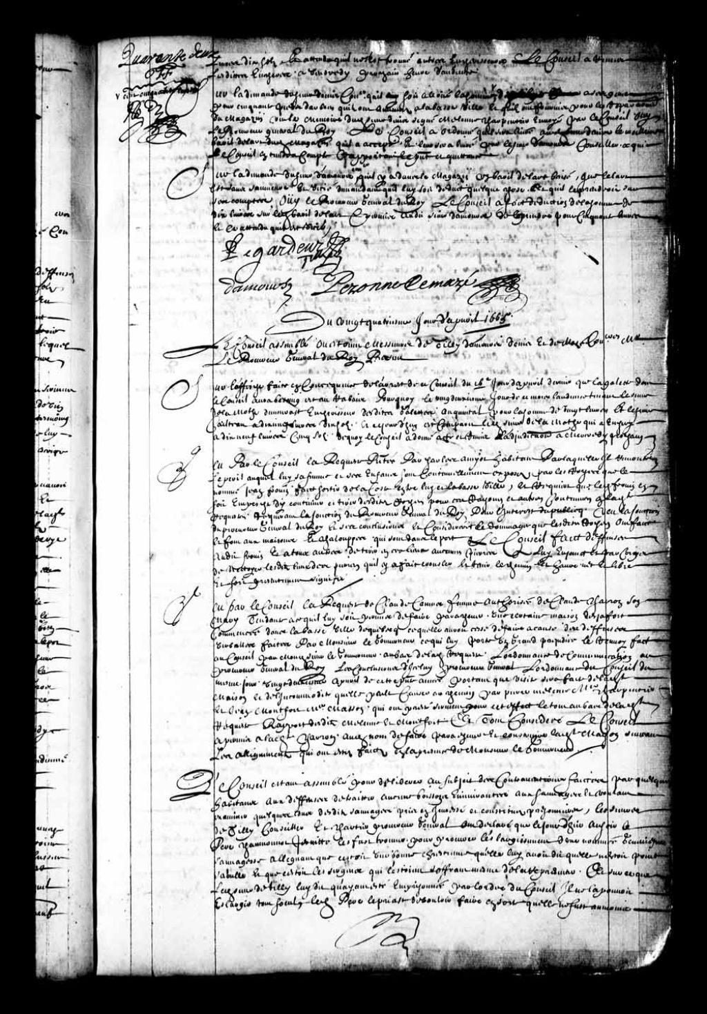 - Transcription du texte avec orthographe modernisée : «Le Conseil étant assemblé pour délibérer au sujet des contraventions faites par quelques habitants aux défenses de traiter aucunes boissons enivrantes aux Sauvages et voulant examiner quelques-uns desdits Sauvages pris en ivresse et constitués prisonniers les sieurs de Tilly conseiller et Chartier procureur général ont déclaré que le jourd'hier au soir le père Chaumonnot jésuite les fut trouver pour procurer l'élargissement d'une nommée Geneviève sauvagesse alléguant que c'était une bonne Chrétienne qu'elle lui avait dit qu'elle n'était point soûle et que c'était les sergents qui l'étaient s'offrant même de la représenter. Et sur ce que ledit sieur de Tilly lui dit qu'ayant été emprisonnée par l'ordre du Conseil il ne la pouvait élargir tout seul ledit père le pria de vouloir faire en sorte qu'elle ne fut au moins pas détenue si étroitement à quoi ledit sieur de Tilly eut quelque considération à cause de l'instante prière dudit père et envoyèrent dire au geôlier qu'il ne la tint pas si serrée et qu'il la gardât seulement dans sa chambre et ont lesdits sieurs signé Legardeur de Tilly L. T. Chartier avec paraphes. »