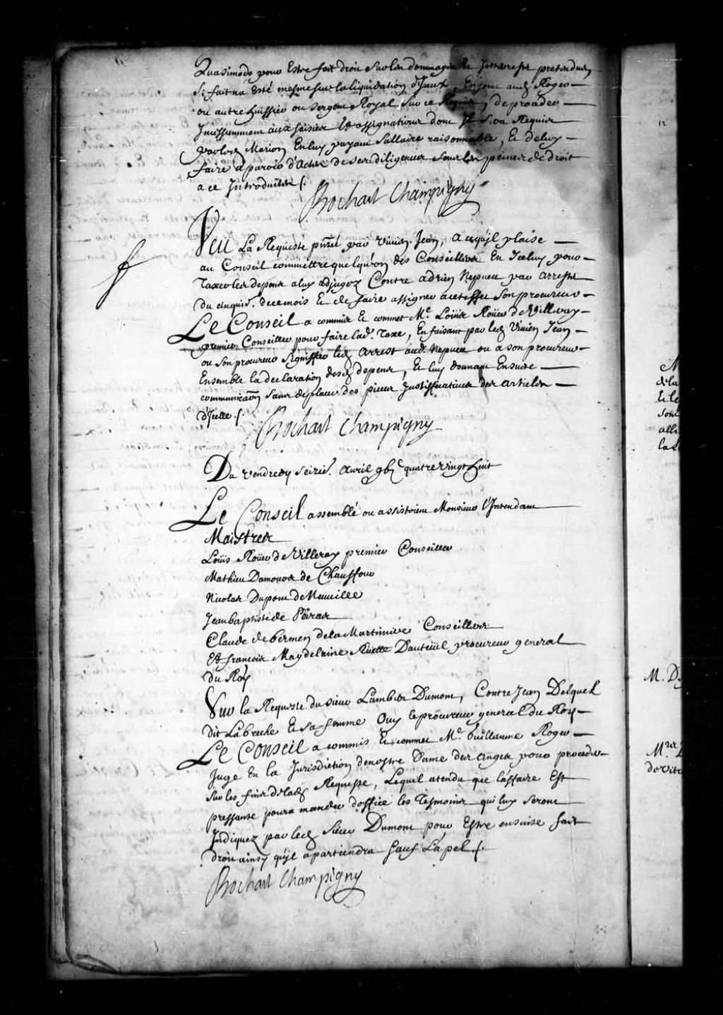 Transcription du texte avec orthographe modernisée : «Vu la requête présentée par Vivien Jean, à ce qu'il plaise au Conseil commettre quelqu'un des conseillers en icelui pour taxer les dépens à lui adjugés contre Adrien Neveu par arrêt du cinquième de ce mois et de faire assigner à cet effet son procureur. Le Conseil a commis et commet maître Louis Rouer de Villeray premier conseiller pour faire ladite taxe, en faisant par ledit Vivien Jean ou son procureur signifier ledit arrêt audit Neveu ou à son procureur ensemble la déclaration desdits dépens, et lui donnant ensuite communication sans déplacer des pièces justificatives des articles d'icelle. BOCHART CHAMPIGNY.»