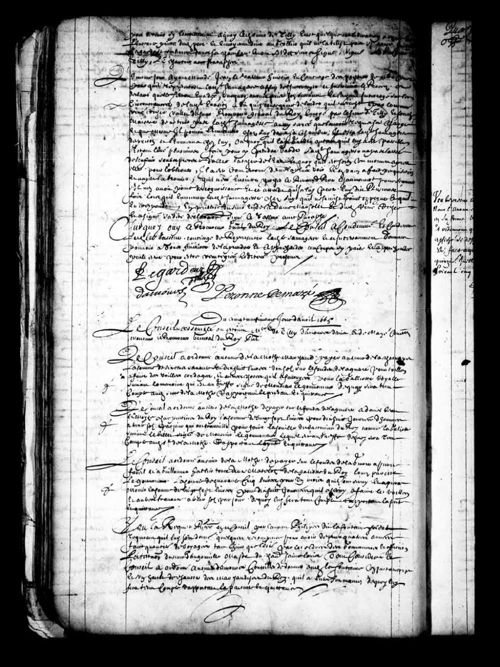 Arrêt qui ordonne au sieur Damours, conseiller, de donner au soldat Laurent Philippe dit Lafontaine, un juste-au-corps et un haut de chausse, en récompense des voyages et autres services rendus, 29 avril 1665, Archives nationales à Québec, Fonds Conseil souverain, (03Q,TP1,S28,P366).