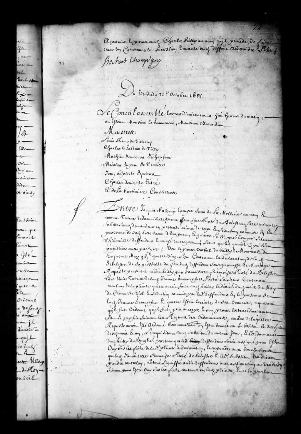 - Transcription du texte avec orthographe modernisée : «Du vendredi 22e octobre 1688. Le Conseil assemblé extraordinairement à huit heures du matin où étaient Monsieur le gouverneur, Monsieur l'intendant. Maîtres Louis Rouer de Villeray. Charles Legardeur de Tilly. Mathieu Damours Dechaufour. Nicolas Dupont de Neuville. Jean-Baptiste Depeiras. Charles Denys de Vitré. Et de la Martinière conseillers. Entre Jacques MALERAY écuyer sieur de LA MOLLERIE au nom et comme tuteur de demoiselle Jeanne Geneviève Picoté de Belestre fille mineure sa belle soeur, demandeur en prétendu crime de rapt et séduction commis en la personne de sa dite belle soeur d'une part, et Pierre LEMOYNE, écuyer sieur d'HIBERVILLE défendeur et accusé d'autre part; sans que les qualités puissent préjudicier aux parties; vu le procès-verbal du bailli de Montréal du onzième mai mille six cent quatre-vingt-six contenant la déclaration de ladite de Belestre de sa grossesse du fait dudit défendeur sous promesse de mariage requête présentée audit bailli par demoiselle Françoise Picoté de Belestre lors élue tutrice de ladite Jeanne Geneviève Picoté sa soeur contenant mention de la plainte qu'elle aurait faite audit bailli le dixième dudit mois de mai de crime de viol et séduction commis par ledit défendeur en la personne de ladite Jeanne Geneviève et qu'elle était enceinte de ses oeuvres, requérant qu'il fût ordonné qu'il fût pris au corps et son procès extraordinairement fait et parfait suivant les rigueurs des ordonnances, au bas de laquelle requête aurait été ordonné communication en être donnée au substitut le dix-huit desdits mois et an, le réquisitoire dudit substitut du même jour, et l'ordonnance dudit bailli du vingtième portant que ledit défendeur serait assigné pour être ouï sur les faits de ladite plainte et déclaration, et répondre aux conclusions que ladite demoiselle Françoise Picoté de Belestre et ledit substitut voudraient prendre contre lui, le tout signifié audit défendeur avec assignation au vendredi suivant pour être ouï sur les faits contenus en ladite plainte, et ce en parlant à la demoiselle sa mère en sa maison dernier domicile du défendeur, suivant l'exploit de Cabazié sergent royal en date dudit jour vingtième mai seconde signification faite audit défendeur desdites requête et ordonnance dudit jour vingtième mai, au domicile élu par Charles Lemoyne écuyer sieur de Longueuil en la maison de Jacques LeBer marchand bourgeois de Ville-Marie île de Montréal avec assignation au dernier jour dudit mois suivant autre exploit dudit Cabazié du vingt-septième du même mois, défaut donné à ladite Françoise Picoté à l'encontre du défendeur faute de comparution, ledit défaut faisant mention qu'icelui défendeur était absent et parti pour voyage de long cours daté dudit jour dernier mai, autre requête de ladite demoiselle Françoise Picoté communiquée audit substitut le cinquième juin par ordonnance dudit bailli au bas de laquelle est son réquisitoire du même jour qu'il n'empêchait que le défendeur ne fut ajourné personnellement pour répondre sur les fins de l'accusation portée par la première requête de ladite demoiselle Françoise Picoté, et la sentence dudit bailli du septième du même mois de juin portant permission à elle de faire preuve dans trois mois de la vérité du prétendu rapt, et ce par information de l'intrigue et familiarité du défendeur et de ladite Jeanne Geneviève Picoté. Copie de certificats du sieur chevalier de Callière gouverneur de ladite île en date du seizième dudit mois de juin portant que ledit défendeur était parti allant pour le service de sa Majesté à la baie du nord en qualité de lieutenant du détachement commandé par le sieur de Troyes. Autre copie de certificat du sieur Bouthier dudit jour portant que ledit défendeur était parti dès le premier avril, l'un et l'autre signifiés à ladite demoiselle Françoise Picoté de Belestre par Quesneville sergent suivant son exploit du septième dudit mois de juin. Copie de requête dudit sieur de Longueuil, et de sentence dudit bailli du neuvième dudit mois de juin portant surséance à toutes procédures et au jugement de la contumace jusqu'au retour du défendeur, pendant lequel temps il ne serait en manière quelconque procédé contre lui, le tout signifié à ladite demoiselle Françoise Picoté par ledit Quesneville le lendemain copie de requête présentée audit bailli par ladite Jeanne Geneviève Picoté de sentence rendue sur icelle le dixième du même mois portant qu'avant faire droit sur icelle ledit défendeur serait assigné au retour de son voyage, et ce en confirmation et conformité de sa dite sentence portant sur séance pourquoi il ne pouvait rien adjuger à ladite Jeanne Geneviève Picoté pour ses aliments et nourriture de son enfant à naître, et que cependant et par provision ladite demoiselle Françoise Picoté sa soeur lui fournirait les sommes requises et nécessaires pour sa nourriture, et pourvoirait d'une nourrice à l'enfant pour l'allaiter, nourrir et élever, à reporter par elle sur les biens de sa dite soeur à elle échus en la succession de ses père et mère sur peine de répondre en son propre et privé nom des suites et accidents de sa grossesse et enfant sauf en définitive d'en faire répétition contre qui il appartiendra, enjoint audit substitut de veiller de quinzaine en quinzaine à ladite Jeanne Geneviève et à la conservation de son fruit, et à lui faire trouver une nourrice, et d'en certifier de temps à autre ledit bailli, et d'autre sentence dudit bailli en date du lendemain rendue sur le rapport de demoiselle Marie de Belestre de la part de sa dite soeur aînée qui demandait sa dite requête du jour précédant lui être rendue icelle sentence portant qu'attendu qu'il était important qu'elle restât au greffe en original pour les causes y mentionnées le tout lui être 
