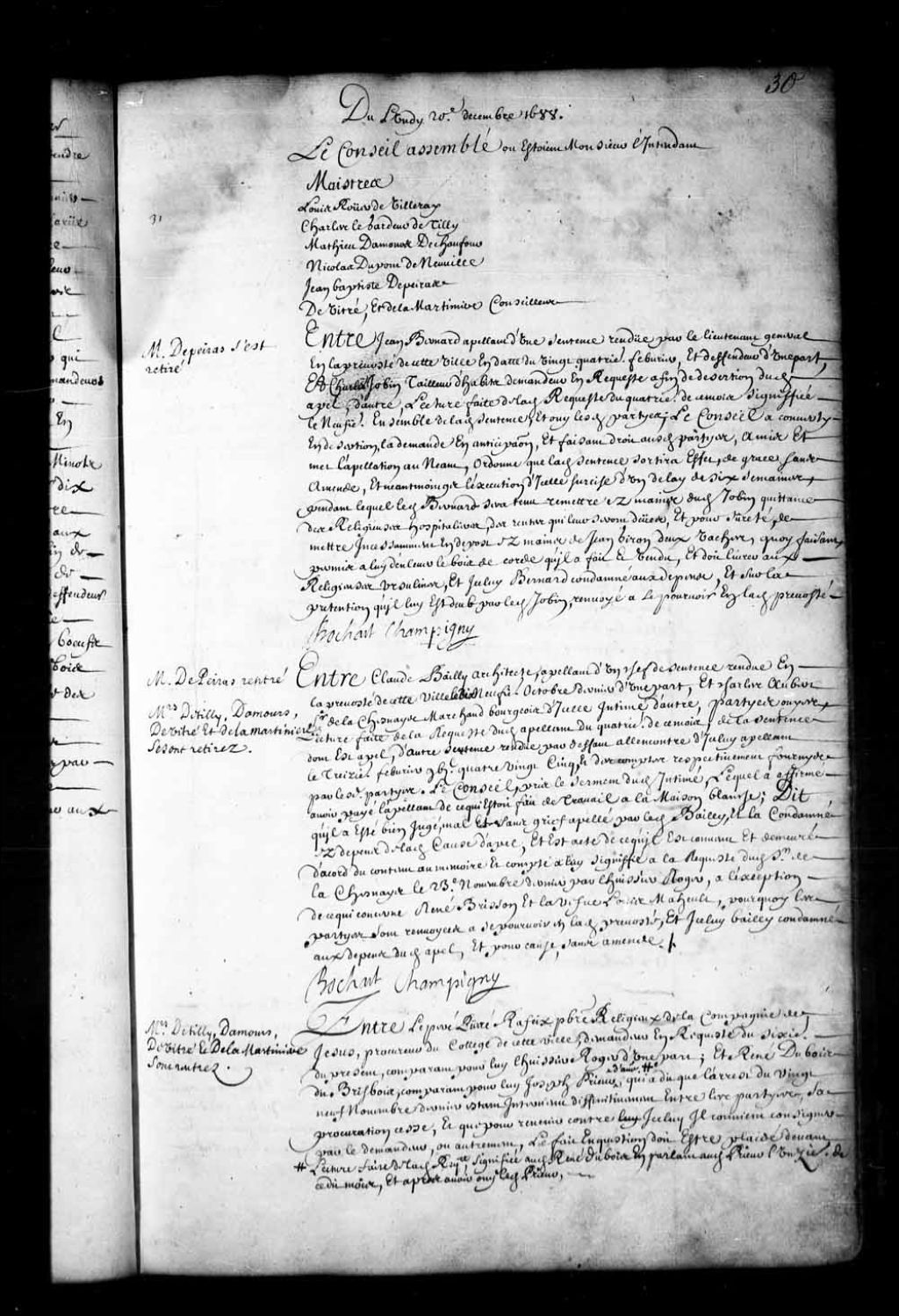 - Transcription du texte avec orthographe modernisée : «Messieurs de Tilly Damours, de Vitré et de la Martinière sont rentrés. Entre le père Pierre Rafeix prêtre religieux de la compagnie de Jésus, procureur du collège de cette ville, demandeur en requête du sixième du présent comparant pour lui l'huissier Roger d'une part; et René Dubois dit BRISBOIS, comparant pour lui Joseph Prieur d'autre, lecture faite de ladite requête signifiée audit Dubois en parlant audit Prieur l'onzième de mois, et après avoir René ouï ledit Prieur qui a dit que l'arrêt du vingt-neuf novembre dernier étant intervenu définitivement entre les parties, sa procuration cesse, et que pour revenir contre icelui il convient consigner par le demandeur, ou autrement, le fait en question doit être plaidé devant le juge des lieux, et ledit René Dubois assigné sur les fins de ladite requête en parlant à sa personne ou au domicile sur lesdits lieux. Le Conseil pour éviter les procédures a ordonné et ordonne que ledit Prieur répondra, et sur ce ouï lesdits Roger et Prieur, ledit Conseil évoquant à soi l'instance et faisant droit ordonne suivant les offres dudit Prieur, que ledit René Dubois aura autant de bétail sur la terre qu'il tient à ferme qu'il en doit avoir suivant l'inventaire, et que s'il arrive par sa faute de grosses réparations à faire au moulin en dépendant, il en sera tenu, et au surplus sera ledit arrêt du vingt-neuvième novembre suivi et exécuté, les dépens du présent arrêt compensés. BOCHART CHAMPIGNY.»