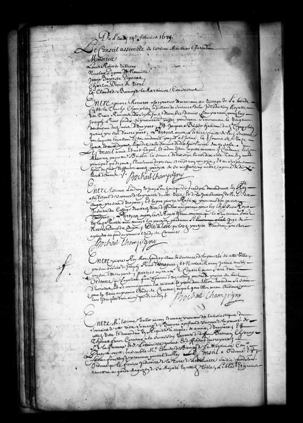 Transcription du texte avec orthographe modernisée : «Entre Pierre Roy marchand, appelant de sentence de la prévôté de cette ville, présent assisté de Joseph Prieur d'une part, et Nicolas MARION intimé aussi présent d'autre part. Parties ouïes, le Conseil avant faire droit ordonne que l'appelant fera apparaître d'un certain prétendu projet de bail d'entre elles, et se communiqueront les raisons et pièces dont elles entendent se servir pour en venir au premier lundi de carême, auquel jour elles auront audience pour leur être fait droit ainsi que de raison. BOCHART CHAMPIGNY.»