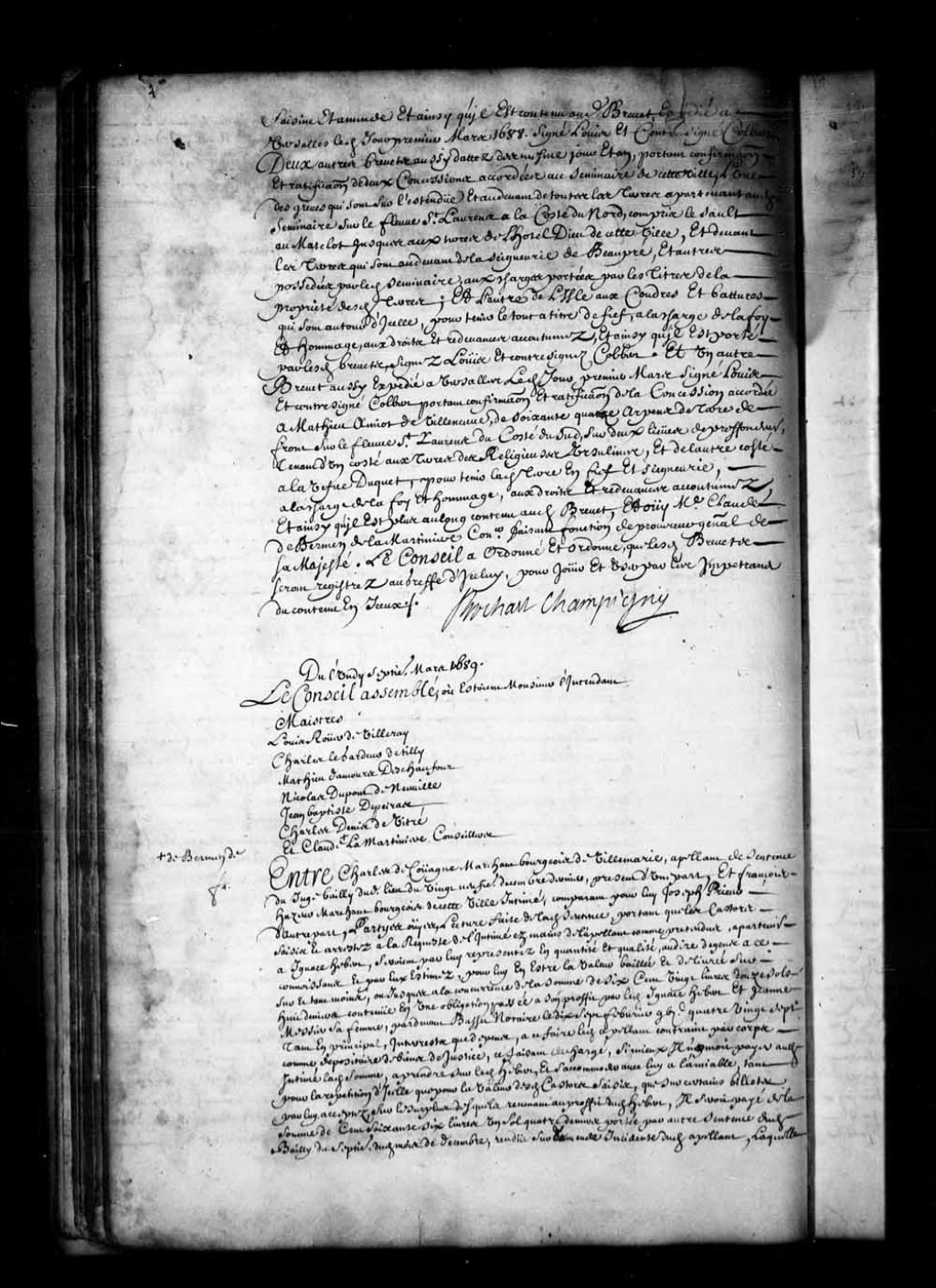 - Transcription du texte avec orthographe modernisée : «Du lundi septième mars 1689. Le Conseil assemblé, où étaient Monsieur l'intendant Maîtres Louis Rouer de Villeray. Charles Legardeur de Tilly. Mathieu Damours Deschaufour. Nicolas Dupont de Neuville Jean-Baptiste Depeiras. Charles Denys de Vitré. Et Claude de Bermen de la Martinière conseillers. Entre Charles de COUAGNE marchand bourgeois de Ville-Marie, appelant de sentence du juge bailli dudit lieu du vingt-neuvième décembre dernier, présent d'une part, et François HAZEUR marchand bourgeois de cette ville intimé, comparant pour lui Joseph Prieur d'autre part. Parties ouïes, lecture faite de ladite sentence, portant que les castors saisis et arrêtés à la requête de l'intimé en les mains de l'appelant comme prétendus, appartenir à Ignace Hébert, seraient par lui représentés en quantité, et qualité, au dire de gens à ce connaissant et par eux estimés pour lui en être la valeur baillée et délivrée sur et tant moins, ou jusqu'à la concurrence de la somme de six cent vingt livres douze sols huit deniers contenue en une obligation passée à son profit par ledit Ignace Hébert et Jeanne Messier sa femme, par-devant Basset notaire le dix-sept février mille six cent quatre-vingt-sept tant en principal, intérêt que dépens, à ce faire ledit appelant contraint par corps comme dépositaire de biens de justice, ce faisant déchargé, si mieux il n'aimait payer audit intimé ladite somme, à prendre sur ledit Hébert, et s'accommoder avec lui à l'amiable, tant pour la répétition d'icelle que pour la valeur desdits castors saisis, que sur certains billets par lui acceptés, sur le surplus desquels revenant au profit dudit Hébert, il serait payé de la somme de soixante-six livres un sol quatre deniers portée par autre sentence dudit Bailli du septième dudit mois de décembre, rendue sur demande incidente dudit appelant, laquelle sentence ledit bailli aurait interprétée sur la déclaration judiciaire d'icelui appelant le seizième novembre, et lesdits Hébert et sa femme solidairement condamnés aux intérêts de ladite somme du jour de la demande jusqu'à l'actuel payement et aux dépens taxés à quinze livres dix sols. Comme aussi des pièces mentionnées en ladite sentences d'un certificat signé Mailhot du vingt-six janvier dernier, d'autre certificat du même jour signé le Gay, et d'un autre certificat en date du lendemain signé d'argenteuil, par lesquels certificats il paraît que ledit Hébert avait mis sondit castor chez l'appelant pour le payer de ce qu'il lui devait de déclaration dudit Hébert faite par-devant le sieur Gaillard commissaire de la marine et subdélégué de Monsieur l'intendant le trentième dudit mois de janvier contenant entre autres choses que les pelleteries en question provenaient des marchandises dont ledit appelant était caution, et des soins et industrie dudit Hébert. Lecture aussi faites des autres pièces et procédures par lesdites parties respectivement mises sur le bureau. Le Conseil a mis et met la sentence dont est appel au néant, émendant et faisant droit aux parties ordonne que ledit appelant prendra sur la quantité du castor qui a été mis en ses mains jusqu'à la concurrence de la somme pour laquelle il est caution dudit Hébert, et que le surplus, si surplus y a, sera délivré audit Hazeur, et du consentement dudit de Couagne ordonné qu'il remettra sans aucune garantie de sa part, en les mains de l'intimé, un billet ou cédule du sieur de Laforest audit Hébert, lequel ledit appelant a dit être de non valeur, en donnant par ledit intimé sa reconnaissance, et icelui intimé condamné aux dépens, sauf à les répéter contre ledit Hébert si faire ce doit. BOCHART CHAMPIGNY.»