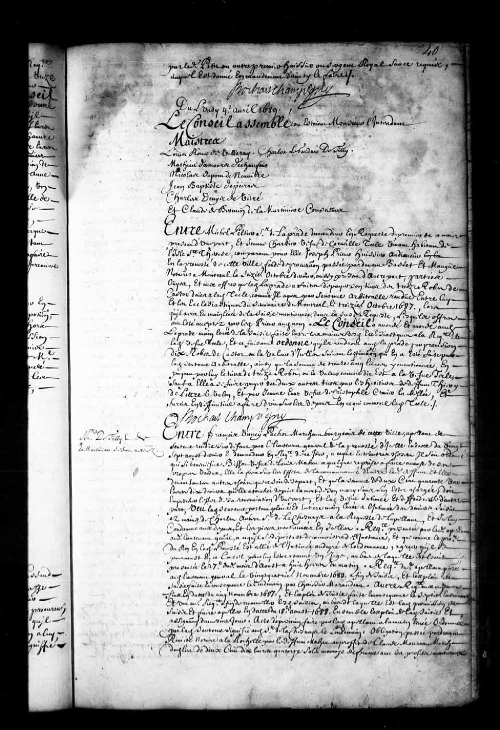 - Transcription du texte avec orthographe modernisée : «Messieurs de Tilly et de la Martinière se sont retirés. Entre François Vienney PACHOT marchand bourgeois de cette ville, appelant de sentence rendue sur défaut par le lieutenant général de la prévôté d'icelle en date du vingt-sept août dernier et demandeur en requête de ce jour, à ce que entre autres choses il soit ordonné que si Geneviève Bissot veuve de Louis Maheu a quelque reprise à faire à cause de ses propre vendus, elle la fera sur les effets de la communauté d'entre ledit défunt et elle devant toutes autres choses que ce soit de sa part, et que la somme de deux cent quarante et une livres dix deniers qu'elle a touchée depuis la mort de son mari sans s'en être chargée, doit empêcher l'effet de sa renonciation d'une part, et ladite veuve intimée et défenderesse d'autre part, vu ladite sentence portant pleine et entière mainlevée à l'intimée des deniers saisis en les mains de Charles Aubert sieur de Lachesnaie à la requête de l'appelant, et icelui condamné aux dépens, et les pièces mentionnées en icelle. Requête présentée par ledit appelant audit lieutenant général, ce qu'il se déportât de connaître de l'instance, et que comme le procureur du Roi en ladite prévôté est allié de l'intimée au degré de l'ordonnance, agréer qu'il se pourvût en ce Conseil pour lui être nommé un juge, au bas de laquelle est écrit présentée le 27e dudit mois d'août à huit heures du matin. Requête dudit appelant présentée audit lieutenant général le vingt-quatrième novembre 1683 a fin de saisie, et l'exploit de saisie faite en conséquence le lendemain par l'huissier Marandeau. Autre requête aux mêmes fins en date du cinq novembre 1687, et exploit de saisie faite en conséquence le septième ensuivant, et une autre requête afin de renouveler lesdites saisies, au bas de laquelle est ladite permission de saisir et faire appeler en date du 18e août 1688. Ensemble l'exploit de ladite saisie et assignation du même jour. acte d'opposition faite par ledit appelant à la mainlevée ordonnée par ladite sentence signifié audit sieur de Lachesnaie le Lendemain. obligation passée par-devant Rivière notaire à La Rochelle par le défunt Maheu au profit de Claude Moureau marchand dudit lieu de deux cent dix livres quatorze sols monnaie de France avec les profits aventureux à raison de quinze pour-cent payable audit Moureau ou à son ordre, ladite obligation datée du deuxième mai 1682 au bas de laquelle est l'ordre dudit Moureau de payer audit appelant du dix-huitième ensuivant. Et une promesse dudit Maheu de la somme de quarante et une livre trois sols avec pareille grosse au profit de François Pachot fils, payable à lui ou ordre, ladite promesse du 17e desdits mois et an, au dos de laquelle est ordre de payer audit appelant daté du lendemain. Autre requête présentée en ce Conseil par ledit Pachot contenant entre autres choses qu'il avait présenté sa dite requête ledit jour 27e août audit lieutenant général aux fins y énoncées, concluant à être reçu à son appel le dix-huit octobre dernier, signifiée à ladite veuve avec intimation les vingt-deux desdits mois et an. exploit portant signification de remise a huitaine de la cause, faite à l'intimée le neuvième novembre ensuivant. Arrêt du 15e novembre audit an 1688 portant appointement à se communiquer par les parties, de main à main sous leurs récépissés les pièces dont elles entendraient se servir, pour en venir au lundi suivant. causes d'appel dudit Pachot, signifiée à partie adverse le 7e septembre 1688. Réponses à icelles, signifiées le 24e dudit mois. Répliques dudit appelant, signifiées le septième janvier dernier, autres réponses de l'intimée, signifiées le quatorzième ensuivant. acte par lequel ledit appelant déclarait à ladite intimée qu'il se trouverait en ce Conseil le lundi ensuivant pour la poursuite du jugement du procès, à ce qu'elle eût à s'y trouver, à elle signifié le quinze dudit mois. Un dire dudit appelant signifié à l'intimé le 28e du même mois. Réponses à icelui signifiées à l'appelant le cinquième février aussi dernier. Requête d'icelui appelant du quatorze, signifiée à l'intimée le 21. Un autre dire dudit appelant signifié le 25e arrêt du 28e du même mois de février, portant que les pièces y énoncées seraient jointes aux productions des parties, pour leur être sur le tout fait droit au rapport du conseiller à ce commis. Un extrait des comptes dudit défunt Maheu, du livre de Charles Aubert sieur de Lachesnaye, daté du dix-huit dudit mois de février, et délai signé, la requête de ce jour présentée par ledit appelant employée avec les pièces y énoncées et datées, pour nouvelle production, et à ce qu'il fût ordonné que si ladite intimée avait quelque reprise à faire à cause de ses propres vendus elle la ferait sur les effets de ladite communauté avant toute autre chose que ce soit de sa part, et qu'il soit payé de ce qui lui est dû. vente faite sous signatures privées par ledit sieur de Lachesnaie Aubert généralement de tout ce qui lui appartenait en la succession de François Bissot en vertu de son acquêts dudit défunt Maheu, et de ladite intimée, suivant le contrat qui en avait été passé par-devant Duquet notaire le 20e avril 1683. Aux réserves contenues audit seing privé, à Etienne Charet moyennant la somme de treize cent cinquante livres. Contrat d'échange faite par Louis Jolliet et Claire Françoise Bissot sa femme, par-devant Claude Aubert notaire le cinquième avril 1686 de leur part en la terre, bâtiments et tous héritages à eux échus par le décès dudit François Bissot sis en la côte et seigneurie de Lauson et Pointe de Lévy, sans en rien réserver, ni retenir, ni même du moulin en dépendant, audit Etienne Charret et Catherine Bissot sa femme, lesquels en contre échange ont cédé auxdits Jolliet