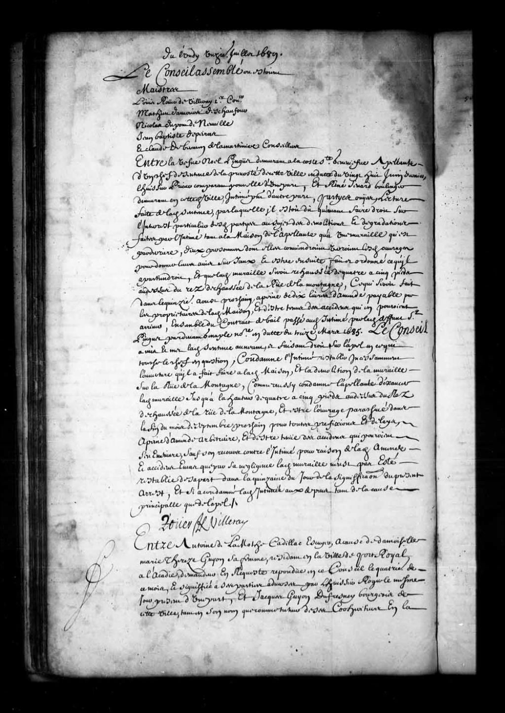 Transcription du texte avec orthographe modernisée : «Du lundi onzième juillet 1689. Le Conseil assemblé où étaient Maîtres Louis Rouer de Villeray premier conseiller. Mathieu Damours Deschaufour. Nicolas Dupont de Neuville. Jean-Baptiste Depeiras. Et Claude de Bermen de la Martinière conseillers. Entre la veuve Noël PINGUET demeurant à la côte Sainte-Geneviève appelante d'un chef de sentence de la prévôté de cette ville en date du vingt-huit juin dernier, l'huissier Prieur comparant pour elle d'une part, et René SENARD boulanger demeurant en cette ville; intimé présent d'autre part. Parties ouïes, lecture faite de ladite sentence, par laquelle il était dit qu'avant faire droit sur l'intérêt particulier desdites parties au sujet des démolitions et dégradations faites par l'intimé tant à la maison de l'appelante qu'à une muraille qui est par derrière, deux personnes dont elles conviendraient verraient lesdits ouvrages pour donner leurs avis sur iceux et être ensuite fait et ordonné ce qu'il appartiendrait, et que ladite muraille serait rehaussée de quatre à cinq pieds au-dessus du rez-de-chaussée de la rue de la montagne, ce qui serait fait dans le quinzième août prochain, à peine de dix livres d'amende payable par les propriétaires de ladite maison, et d'être tenus des accidents qui en pourraient arriver, ensemble du contrat de bail passé audit intimé par ledit défunt sieur Pinguet par-devant Genaple notaire en date du treize mars 1685. Le Conseil a mis et met ladite sentence au néant, et faisant droit sur l'appel en ce qui touche le chef en question, condamne l'intimé rétablir incessamment l'ouverture qu'il a fait faire à ladite maison, et la démolition de la muraille sur la rue de la Montagne, comme aussi condamne l'appelante d'exhausser ladite muraille jusqu'à la hauteur de quatre à cinq pieds au-dessus du rez-de-chaussée de la rue de la Montagne, et être l'ouvrage parachevé dans la fin du mois de septembre prochain pour toutes préfixions et délais, à peine d'amende arbitraire, et d'être tenue des accidents qui pourraient s'en ensuivre, sauf son recours contre l'intimé pour raison de ladite amende et accidents en cas que par sa négligence ladite muraille n'eut pas été rétablie de sa part dans la quinzaine du jour de la signification du présent arrêt, et ci a condamné ladite intimée aux dépens tant de la cause principale que de l'appel. ROUER DE VILLERAY.»