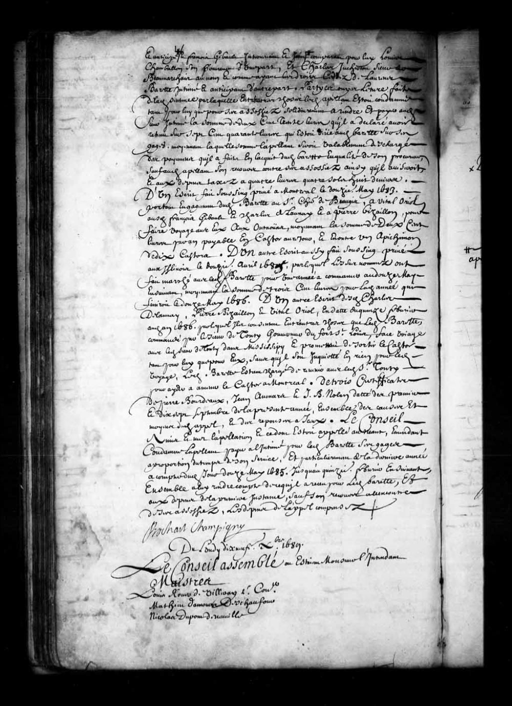 - Transcription du texte avec orthographe modernisée : «Du lundi dix-neuvième décembre 1689. Le Conseil assemblé où étaient Monsieur l'intendant Maîtres Louis Rouer de Villeray premier conseiller. Mathieu Damours Deschaufour. Nicolas Dupont de Neuville. Jean-Baptiste Depeiras. Et Charles Denys de Vitré conseillers. Et François Madeleine Ruette d'Auteuil procureur général du Roi. Entre Pierre VIAU, Jean de MERA et Barthélemy BERGERON appelant de sentence de la prévôté de cette ville du vingt-neuf novembre dernier d'une part, et François Vienney PACHOT marchand bourgeois de cette dite ville, directeur de la Compagnie du Nord, faisant pour ladite compagnie, Charles Aubert sieur de Lachesnaye, et Jean GOBIN aussi marchands bourgeois de cette dite ville, intéressés en ladite compagnie, intimés présents d'autre part. Parties ouïes, lecture faite de ladite sentence par laquelle ledit sieur Pachot est renvoyé de l'action à lui intentée par les appelant pour raison des gages par eux prétendus, aux dépens. De trois billets signés d'Hiberville (Iberville) y mentionnés, ensemble d'un acte du vingt et un décembre 1685, signé par collation Basset notaire à Montréal le dix-septième mars 1686. Et d'un autre acte du onze dudit mois de novembre porté sur le livre des délibérations de ladite compagnie représenté par ledit sieur Pachot. Le Conseil a mis et met ladite appellation au néant, ordonne que la sentence dont est appel sortira effet, condamne les appelant en trois livres d'amende, et aux dépens de la cause d'appel. BOCHART CHAMPIGNY.»