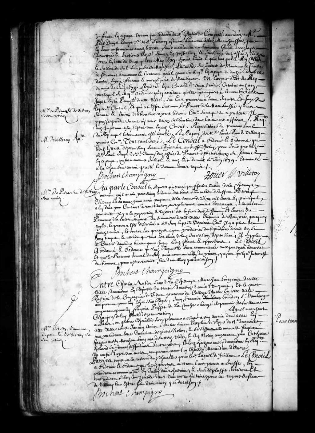 Transcription du texte avec orthographe modernisée : «Messieurs Depeiras et de Vitray sont rentrés. Vu par le Conseil la requête présentée par Charles Aubert de Lachesnaye, contenant qu'il aurait poursuivi le décret des biens immeubles de défunt Bertrand Chesnay LaGarenne, pour avoir payement de la somme de six mille livres en principal, à lui due par contrat de constitution, avec plusieurs années d'arrérages, à laquelle poursuite il y a eu opposition de la part des enfants dudit défunt, et encore du procureur des ecclésiastiques du séminaire de cette ville seigneurs de Beaupré, pourquoi régler, le procès a été distribué à maître Jean-Baptiste Depeiras conseiller il y a plus de quinze mois, et toutes les parties ayant produit ou dû produire depuis un si long temps, et attendu que tous les biens de ladite succession dépérissent, il supplie ce Conseil d'accorder bureau pour juger lesdits procès et oppositions. Le Conseil a ordonné et ordonne que ladite requête sera communiquée aux parties adverses et que le procureur général du Roi aura communication du procès, y ayant quelque intérêt de mineurs, pour être ensuite fait droit ainsi que de raison. BOCHART CHAMPIGNY.»
