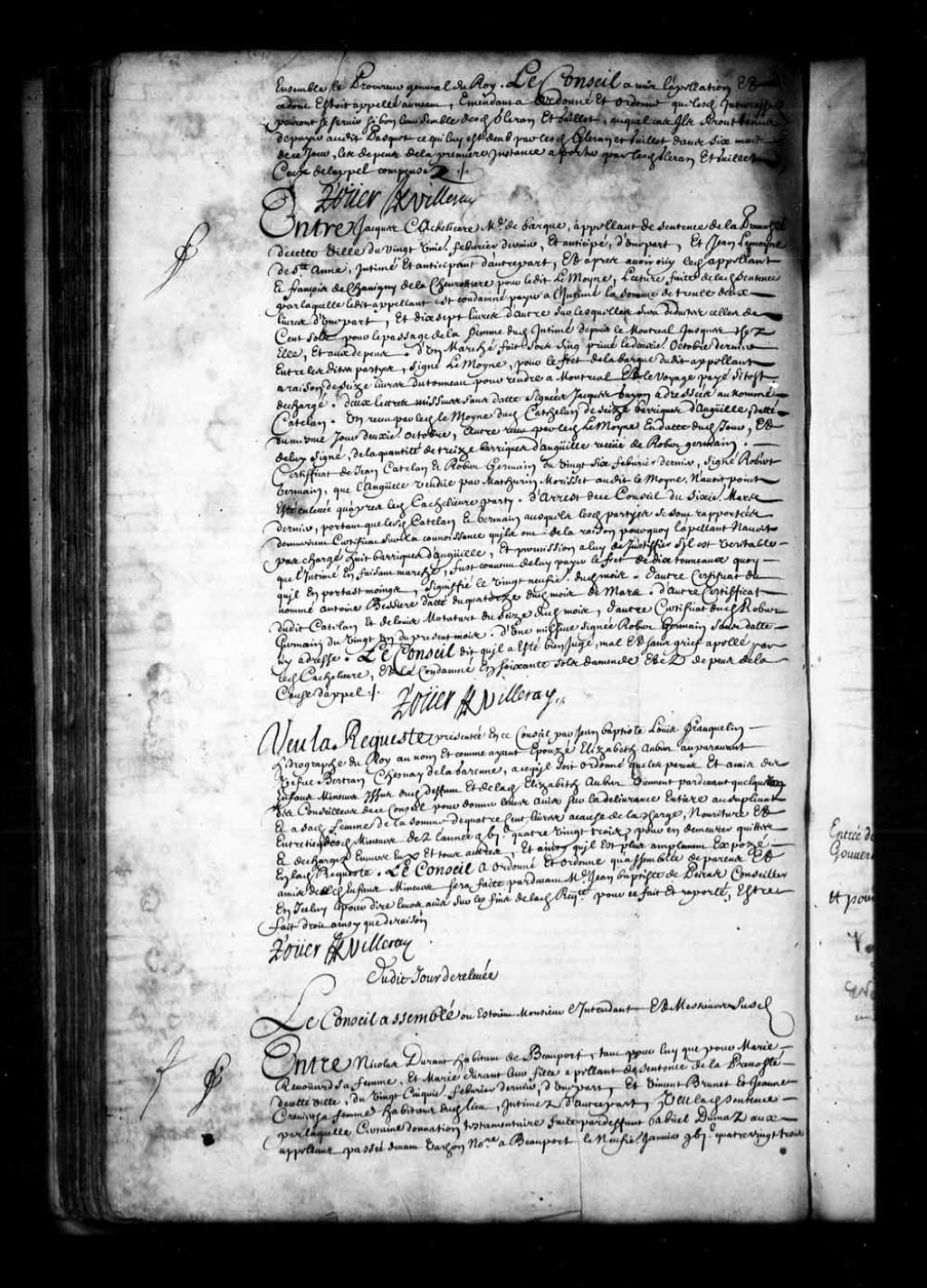 Transcription du texte avec orthographe modernisée : «Vu la requête présentée en ce Conseil par Jean-Baptiste Louis Franquelin hydrographe du Roi au nom et comme ayant épousé Elisabeth Aubert auparavant veuve Bertrand Chesnay de LaGarenne, à ce qu'il soit ordonné que les parents et amis des enfants mineurs issus dudit défunt et de ladite Elisabeth Aubert viennent par-devant quelqu'un des conseillers de ce Conseil pour donner leurs avis sur la délivrance entière au suppliant et à sa dite femme de la somme de quatre cents livres à cause de la charge, nourriture et entretien desdits mineurs dès l'année mille six cent quatre-vingt-trois pour en demeurer quittes et déchargés envers eux et tous autres, et ainsi qu'il est plus amplement exposé en ladite requête. Le Conseil a ordonné et ordonne qu'assemblée de parents et amis desdits enfants mineurs sera faite par-devant maître Jean-Baptiste Depeiras conseiller en icelui pour dire leurs avis sur les fins de ladite requête pour ce fait et rapporté, être fait droit ainsi que de raison. ROUER DE VILLERAY.»