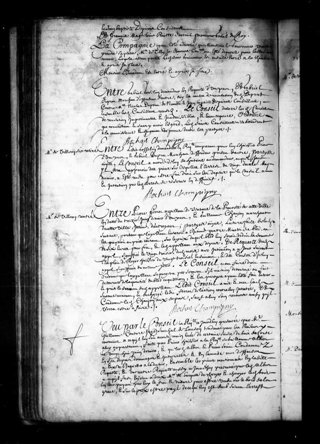- Transcription du texte avec orthographe modernisée : «Vu par le Conseil la requête ce jourd'hui présentée par maître Guillaume Couture juge sénéchal de Lauson tendante pour les raisons y contenues à ce qu'il lui soit accordé mainlevée de certaine saisie de bois de corde à lui appartenant, faite par Prieur huissier à la requête de Guillaume Albert le vingt-huit juin dernier, et que lesdits Albert et Prieur soient condamnés en ses dépens dommages et intérêts et en l'amende avec défenses à eux de l'inquiéter à l'avenir, ensemble les pièces mentionnées en ladite requête, et une autre requête aussi ce jourd'hui présentée par ledit Albert à ce qu'il fût enjoint à deux maîtres de barques de charger et charroyer ledit bois en leur payant par lui le fret et voiture pour être vendu sur le bord de la grève, et sur le prix être payé de ce qui lui est dû suivant l'arrêt du dix-huit avril mille six cent quatre-vingt-neuf. Le Conseil a accordé et accorde mainlevée audit Couture du bois de corde en question à sa caution juratoire, et ordonne que sa dite requête sera communiquée audit Albert, et au procureur fiscal des lieux, pour être ensuite fait droit aux parties ainsi que de raison. BOCHART CHAMPIGNY.»