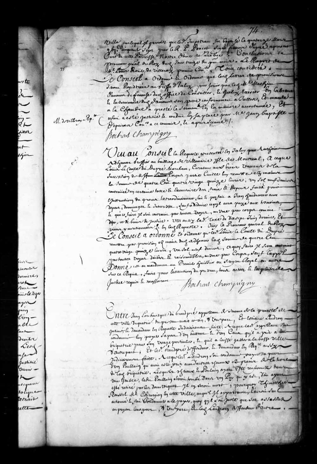 - Transcription du texte avec orthographe modernisée : «Vu au Conseil la requête présentée en icelui par Antoine Adhémar greffier au bailliage de Ville-Marie île de Montréal, à ce que Louis Lecomte dit Dupré marchand, curateur aux biens vacants de la succession de défunt François Poignet partie civile lui remettre en les mains la somme de quatre cent quatre-vingt-quinze livres, un sol neuf deniers contenues en certaine taxe et exécutoire des frais et dépens faits pour l'instruction du procès extraordinairement fait et parfait à Jean Haudecoeur avec dépens, dommages et intérêts, sauf à déduire ce qu'il aura payé aux témoins, et qu'à ce faire il soit contraint par toutes voies, même par corps comme dépositaire de biens de justice. Vu aussi ladite taxe du dix-sept juin dernier, et pièces y mentionnées et en ladite requête. Ouï le procureur général du Roi. Le Conseil a ordonné et ordonne que ledit Louis Lecomte dit Dupré remettra par provision en les mains dudit Adhémar ladite somme quatre cent quatre-vingt-quinze livres, un sol neuf deniers, à quoi faire il sera contraint par toutes voies dues et raisonnables, même par corps, sauf l'appel donné est en mandement au premier huissier ou sergent royal ou autre sur ce requis, faire pour l'exécution du présent, tous actes et exploits de justice requis et nécessaires. BOCHART CHAMPIGNY.»