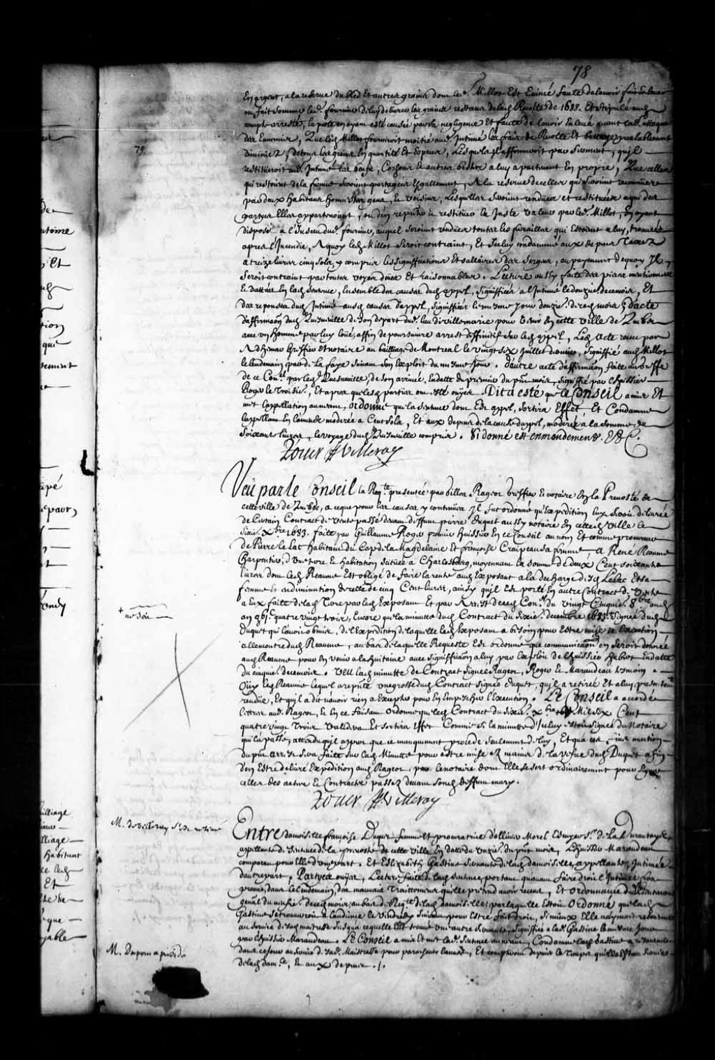 Transcription du texte avec orthographe modernisée : «Monsieur de Villeray s'est retiré. Monsieur Dupont a présidé. Entre demoiselle Françoise DUQUET femme et procuratrice de Olivier Morel écuyer sieur de Ladurantaye, appelante de sentence de la prévôté de cette ville en date du onzième du présent mois, l'huissier Marandeau comparant pour elle d'une part, et Elisabeth GATINO servante de ladite demoiselle appelante, intimée, d'autre part. Parties ouïes, lecture faite de ladite sentence portant qu'avant faire droit l'intimée fera preuve, dans le lendemain, des mauvais traitements qu'elle prétend avoir reçus, et ordonnance dudit lieutenant général du neuvième de ce dit mois, au bas de requête de ladite demoiselle, par laquelle était ordonné que ladite Gastino se trouverait à l'audience le vendredi suivant pour être fait droit, si mieux elle n'aimait retourner au service de sa dite maîtresse jusqu'à ce qu'elle eût trouvé une autre servante,
