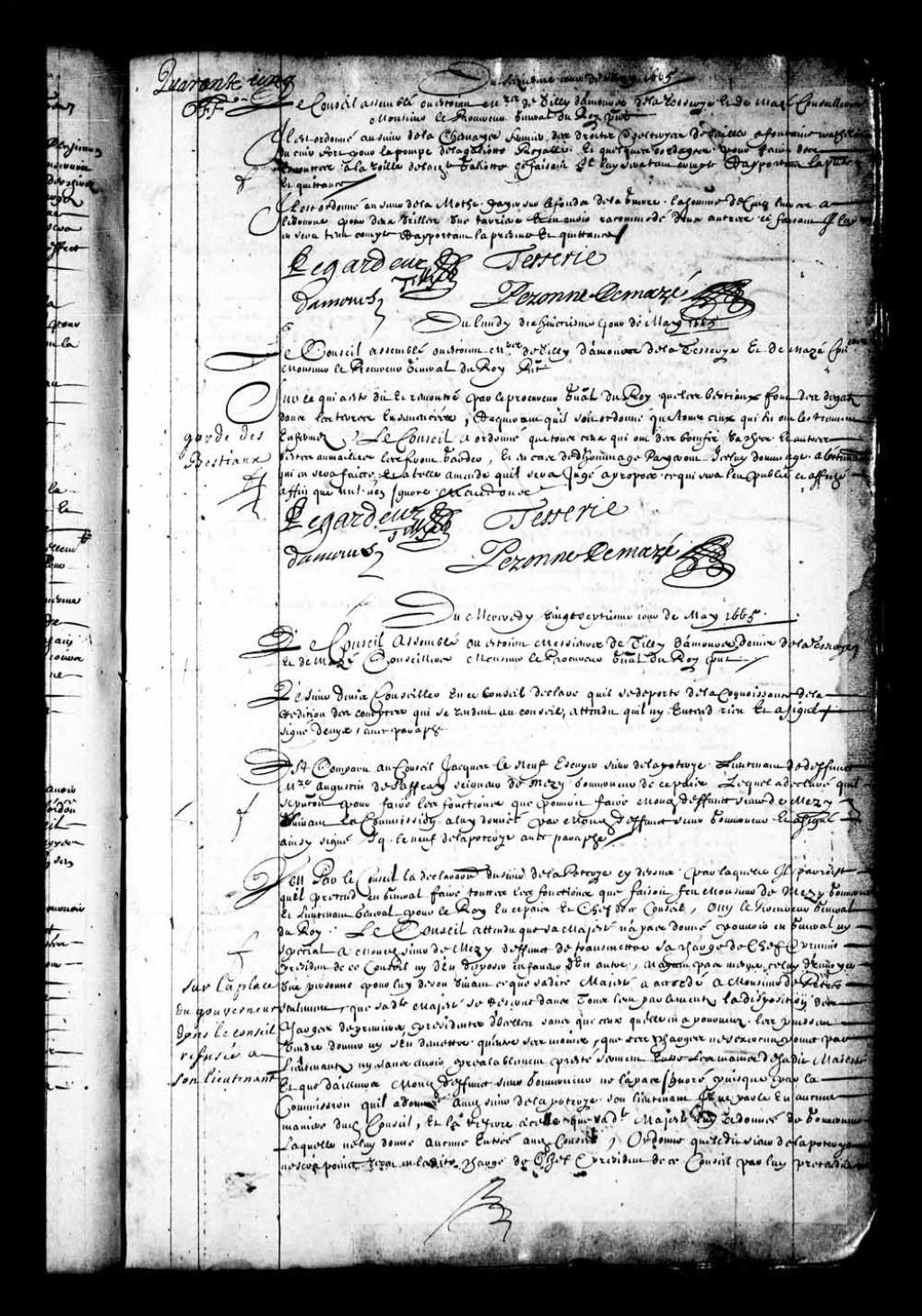 Transcription du texte avec orthographe modernisée : «Est comparu au Conseil Jacques Leneuf écuyer sieur de LaPoterie lieutenant de défunt messire Augustin de Saffray seigneur de Mésy gouverneur de ce pays lequel a déclaré qu'il se présentait pour faire les fonctions que pouvait faire mondit défunt sieur de Mésy suivant la commission à lui donnée par mondit défunt sieur gouverneur et a signé. Ainsi signé Jacques Leneuf de la Poterie avec paraphe.»