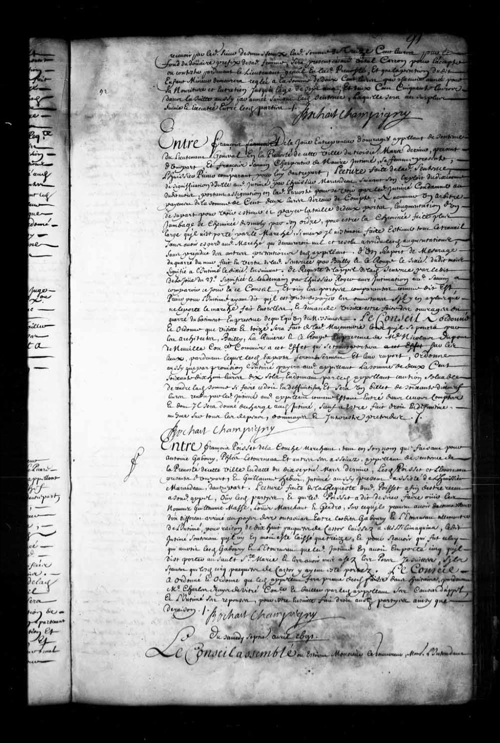 - Transcription du texte avec orthographe modernisée : «Entre François POISSET DE LACOUCHE marchand, tant en son nom que faisant pour Antoine Gaboury, Philippe Letourneau et autres ses associés, appelant de sentence de la prévôté de cette ville en date du dix-septième mars dernier, lesdits Poisset et Letourneau présents d'une part, et Guillaume Hébert, intimé aussi présent assisté de l'huissier Marandeau, d'autre part. Lecture faite de la requête dudit Poisset afin d'être reçu à sondit appel, ouï lesdites parties, et que ledit Poisset a dit désirer faire ouïr les nommés Guillaume Masse, Louis Marchand et Gendro (Gendreau), sur ce qu'ils peuvent avoir de connaissance d'un différent arrivé au pays des outaouais entre lesdits Gaboury et Létourneau à l'encontre de l'intimé, pour raison de dix-huit paquets de castor laissés à Missilimaquina (Michilimakinac), ledit intimé soutenant qu'il n'y en avait été laissé que treize, et pour savoir qui fut celui qui avertit lesdits Gaboury et Letourneau que ledit intimé en avait emporté cinq qu'il dit porter au Sault Sainte-Marie et les avoir mis chez les pères jésuites, s'ils savent que lesdits cinq paquets de castor y aient été portés. Le Conseil a ordonné et ordonne que ledit appelant fera preuve desdits faits dans huitaine, par-devant maître Charles Denys de Vitré conseiller et bailler par ledit appelant ses causes d'appel, et l'intimé ses réponses pour être ensuite fait droit aux dites parties ainsi que de raison. BOCHART CHAMPIGNY.»