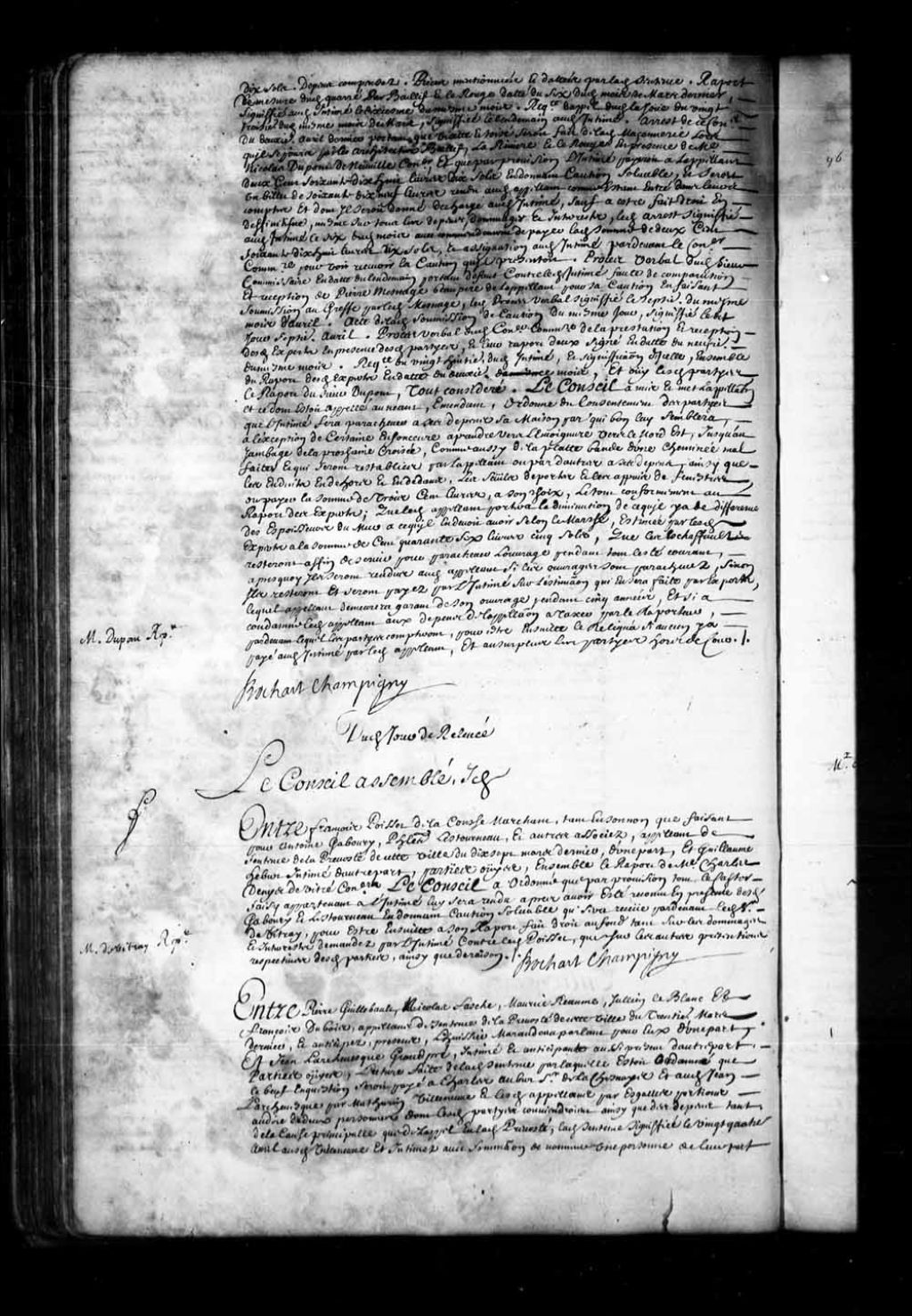- Transcription du texte avec orthographe modernisée : «Dudit jour de relevée. Le Conseil assemblé idem. Entre François POISSET DE LACOUCHE marchand, tant en son nom que faisant pour Antoine Gaboury, Philippe Lestourneau, et autres associés, appelant de sentence de la prévôté de cette ville du dix-sept mars dernier, d'une part, et Guillaume Hébert intimé d'autre part. Parties ouïes, ensemble le rapport de maître Charles Denys de Vitré conseiller. Le Conseil a ordonné que par provision tout le castor saisi appartenant à l'intimé lui sera rendu après avoir été reconnu en présence desdits Gaboury et Lestourneau en donnant caution solvable qui sera reçue par-devant ledit sieur de Vitray, pour être ensuite à son rapport fait droit au fond tant sur les dommages et intérêts demandés par l'intimé contre ledit Poisset, que sur les autres prétentions respectives desdites parties, ainsi que de raison.. Monsieur de Vitray rapporteur. BOCHART CHAMPIGNY.»