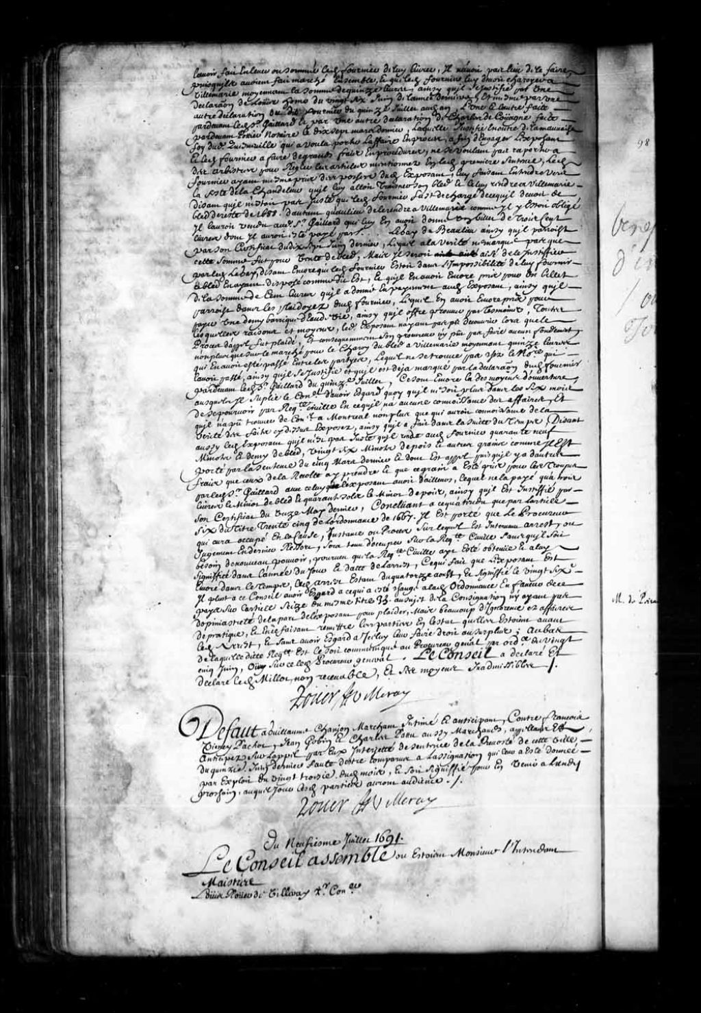 Défaut à Guillaume Changeon (Chanjon), marchand, contre François Viennay-Pachot, Jean Godin et Charles Patu, aussi marchands, faute d'être comparu à l'assignation qui lui fut donné le 23 juin 1691