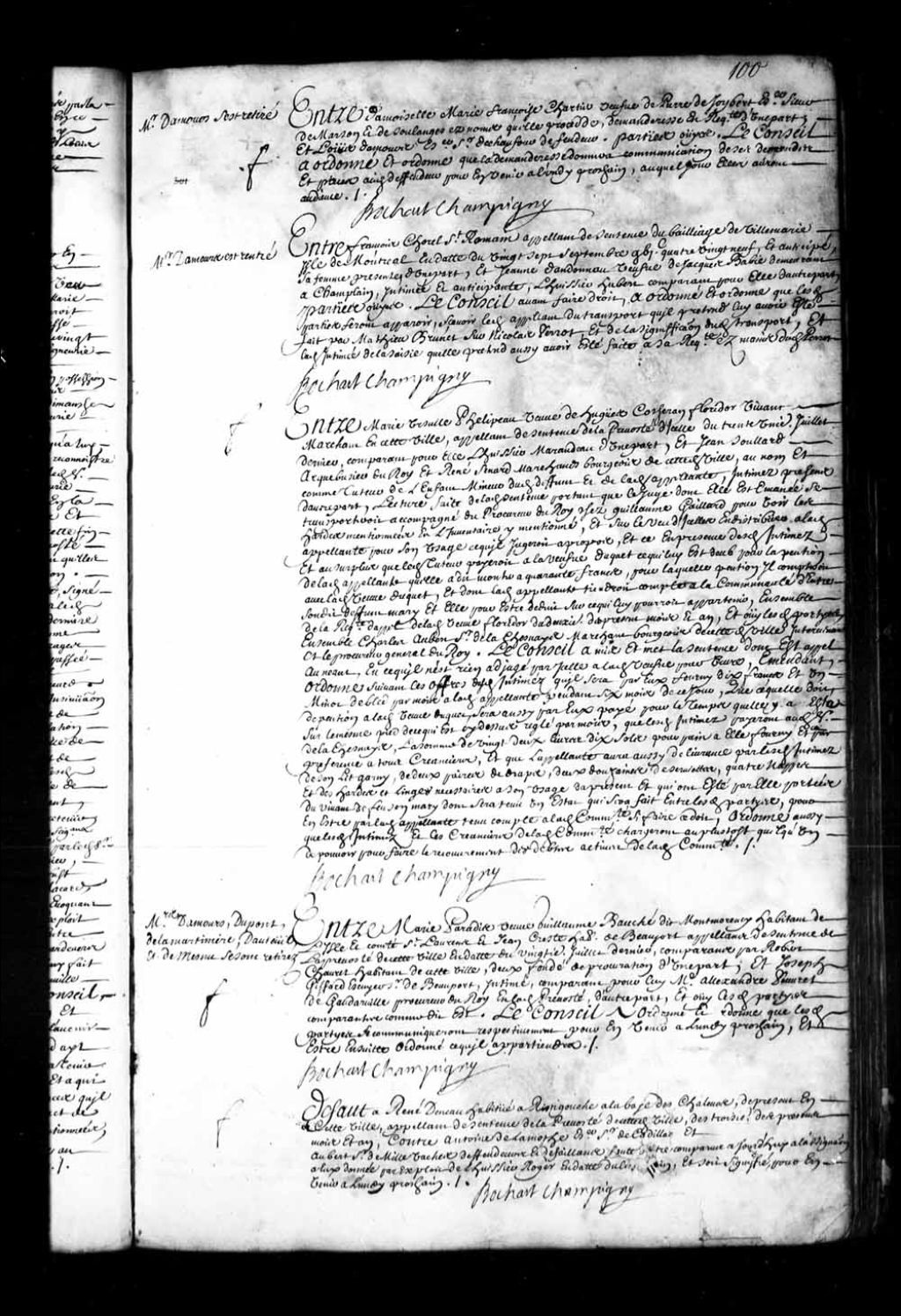 Transcription du texte avec orthographe modernisée : «Monsieur Damours est rentré. Entre François CHOREL sieur ROMAIN appelant de sentence du bailliage de Ville-Marie île de Montréal en date du vingt-sept septembre mille six cent quatre-vingt-neuf, et anticipé, sa femme présente d'une part, et Jeanne DANDONNEAU veuve de Jacques Babie demeurant à Champlain, intimée et anticipante, l'huissier Hubert comparant pour elle d'autre part. Parties ouïes, le Conseil avant faire droit, a ordonné et ordonne que lesdites parties feront apparaître, savoir ledit appelant du transport qu'il prétend lui avoir été fait par Mathieu Brunet sur Nicolas Perrot, et de la signification dudit transport, et ladite intimée de la saisie qu'elle prétend aussi avoir listé faite à sa requête en les mains dudit Perrot. BOCHART CHAMPIGNY.»