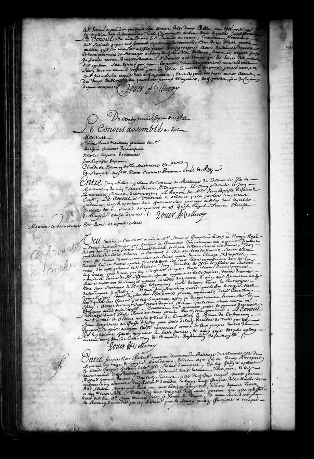 - Transcription du texte avec orthographe modernisée : «Monsieur le gouverneur est entré et a pris place. Vu un titre de concession accordé à maître François Genaple de Bellefond, notaire royal et commis du grand voyer, par Monsieur le gouverneur conjointement avec Monsieur l'intendant en date du vingt-cinq février de l'année dernière, de l'espace de terre située à la Rivière Saint-Jean pays de l'Acadie entre Medoctec (Medoktek) et Nacchouak (Nashouat, Nacchouak) qui joint à la terre de Jemesek (Gemesek, Jemseg, Jemsek, Gemsek, Gemesik), savoir le lieu appelé les longues vues, commençant à la Rivière appelée en nom sauvage Skouteopskok, jusqu'au lieu et Rivière appelée Nerkoiouiquek sur deux lieues en profondeur dans lesdites terres, d'un côté et d'autre ladite Rivière Saint-Jean, ensemble les îles et îlets qui sont dans ladite espace, pour en jouir par lui ses hoirs et ayant cause à l'avenir en pleine propriété a perpétuité en titre de fief, seigneurie, haute, moyenne et basse justice, droits de pêche chasse et traite avec les Sauvages en toute l'étendue desdites terres et ainsi qu'il est contenu audit titre signé Frontenac et Bochard Champigny, scellé de leurs armes et contresigné de Monseignat et Fredin. Brevet de confirmation accordé par le Roi le seizième mars dernier, signé Louis et plus bas Phelipeaux portant confirmation de ladite concession requête présentée en ce Conseil par ledit impétrant afin qu'enregistrement en soit fait en icelui. Arrêt du vingt-sept août dernier portant que le tout serait montré au procureur général de sa Majesté. Conclusions dudit procureur général du premier de ce mois. Le rapport de maître Louis Rouer de Villeray premier conseiller, tout considéré. Le Conseil a ordonné et ordonne que lesdits titre de concession et brevet de confirmation seront enregistrés au greffe d'icelui pour jouir de ladite étendue de terre par ledit Genaple, ses hoirs ou ayant cause a perpétuité comme de leur propre en titre de fief et seigneurie, haute, moyenne et basse justice, et ainsi qu'il est plus au long contenu auxdits titre de concession et brevet de confirmation de sa Majesté. ROUER DE VILLERAY.»