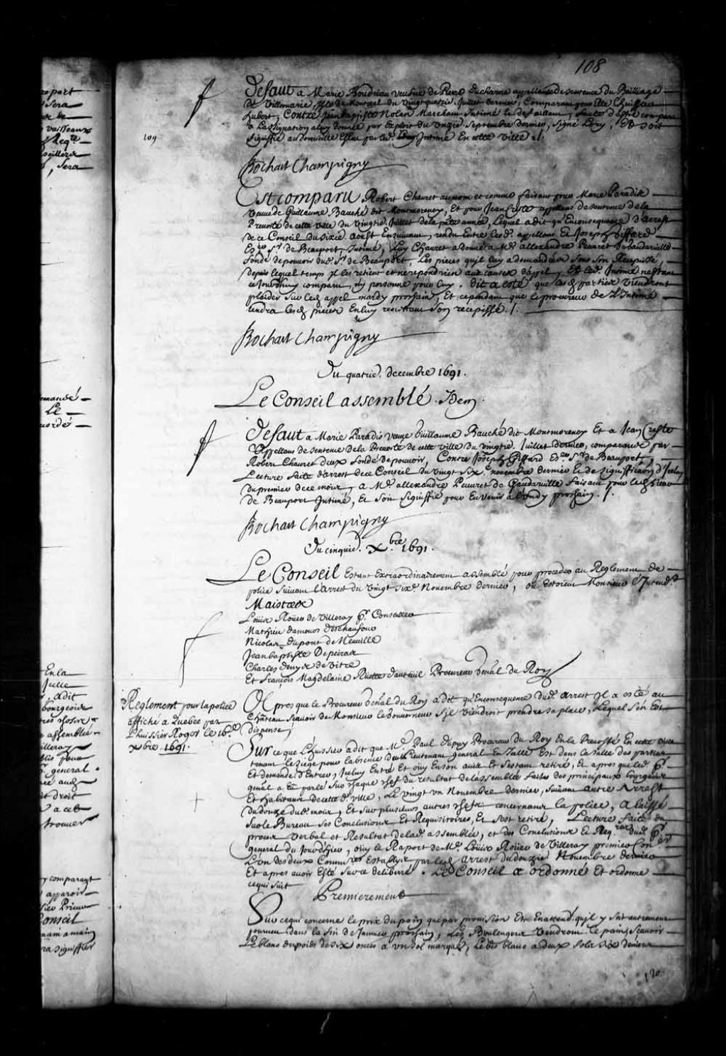 Transcription du texte avec orthographe modernisée : «Du quatrième décembre 1691. Le Conseil assemblé Idem. Défaut à Marie Paradis veuve Guillaume Bauché (Baucher) dit Montmorency (Morency) et à Jean Creste (Crête) appelant de sentence de la prévôté de cette ville du vingtième juillet dernier, comparant par Robert Chauret (Choret) d'eux fondé de pouvoir, contre Joseph Giffard écuyer sieur de Beauport, lecture faite d'arrêt de ce Conseil du vingt-sixième novembre dernier et de signification d'icelui du premier de ce mois, à maître Alexandre Peuvret de Gaudarville faisant pour ledit sieur de Beauport intimé, et soit signifié pour en venir à lundi prochain. BOCHART CHAMPIGNY.»