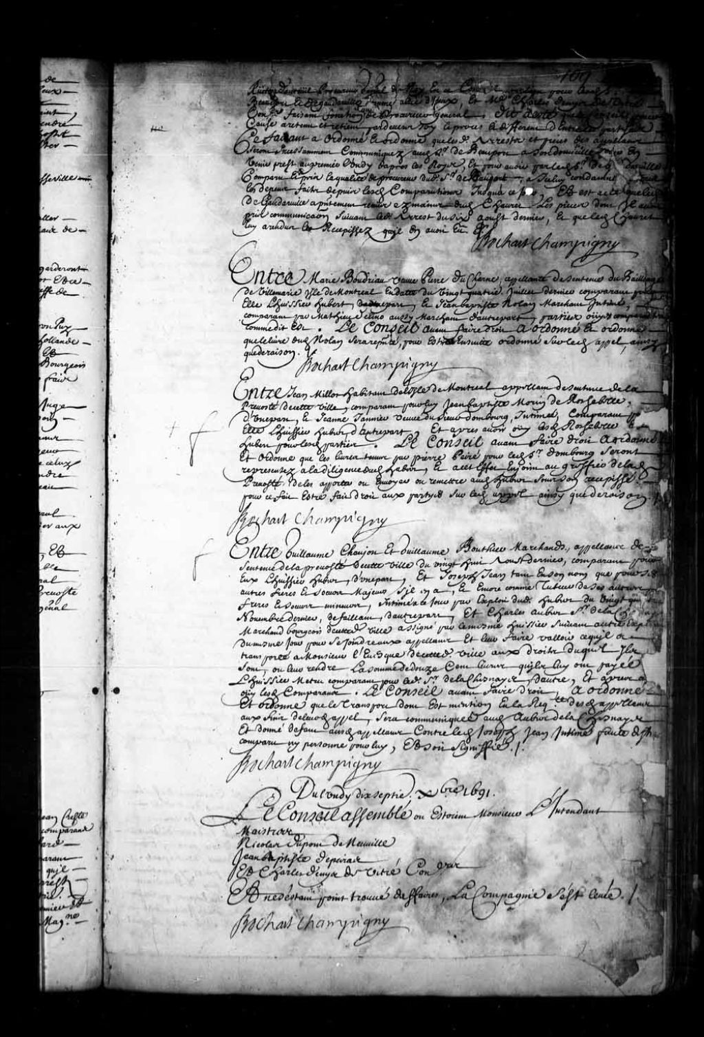 Transcription du texte avec orthographe modernisée : «Entre Jean MILLOT (Milot) habitant de l'île de Montréal appelant de sentence de la prévôté de cette ville, comparant pour lui Jean-Baptiste Morin de Rochebelle, d'une part, et Jeanne JANNIER veuve du sieur Dombourg, intimée, comparant pour elle l'huissier Hubert, d'autre part, et après avoir ouï lesdits Rochebelle et Hubert pour lesdites parties. Le Conseil avant faire droit a ordonné et ordonne que les livres tenus par Pierre Peiré pour ledit sieur Dombourg seront représentés à la diligence dudit Hubert, et à cet effet enjoint au greffier de ladite prévôté de les apporter ou envoyer ou remettre audit Hubert sous son récépissé, pour ce fait être fait droit aux parties sur ledit appel ainsi que de raison. BOCHART CHAMPIGNY.»