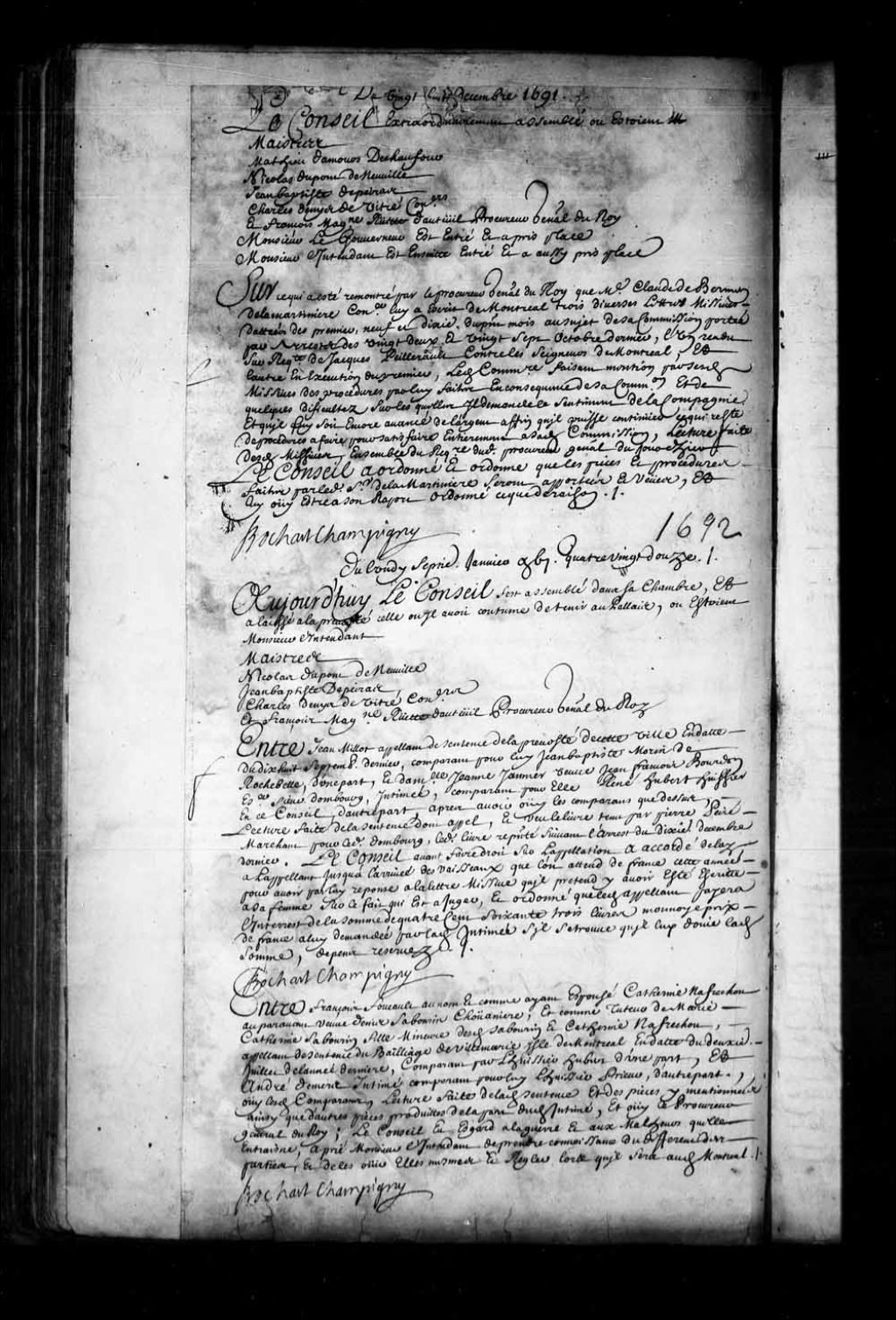 Délai accordé à Jean Milot contre Jeanne Jannier, veuve de Jean-François Bourdon, écuyer et sieur Dombourg, jusqu'à l'arrivée des vaisseaux attendu de France afin d'obtenir réponse d'une certaine lettre missive écrite à sa femme concernant la dite cause; le dit Milot payera l'intérêt de la somme de 463 livres à la dite Jannier, 7 janvier 1692, Archives nationales à Québec, Fonds Conseil souverain, (03Q,TP1,S28,P4075).