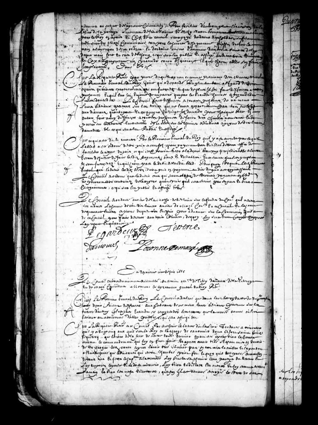 Transcription du texte avec orthographe modernisée : «Le Conseil a ordonné au sieur de LaMothe de délivrer sur le fonds du Conseil qu'il a entre ses mains la somme de cent dix livres au sieur de Mazé conseiller en ce Conseil et la somme de quarante livres à Pierre Duquet son greffier pour avance sur la commission qu'il a de ce Conseil pour faire descente aux Trois-Rivières de quoi lui sera tenu compte rapportant la présente et quittance. LEGARDEUR DE TILLY DAMOURS, TESSERIE PERONNE DEMAZÉ.»