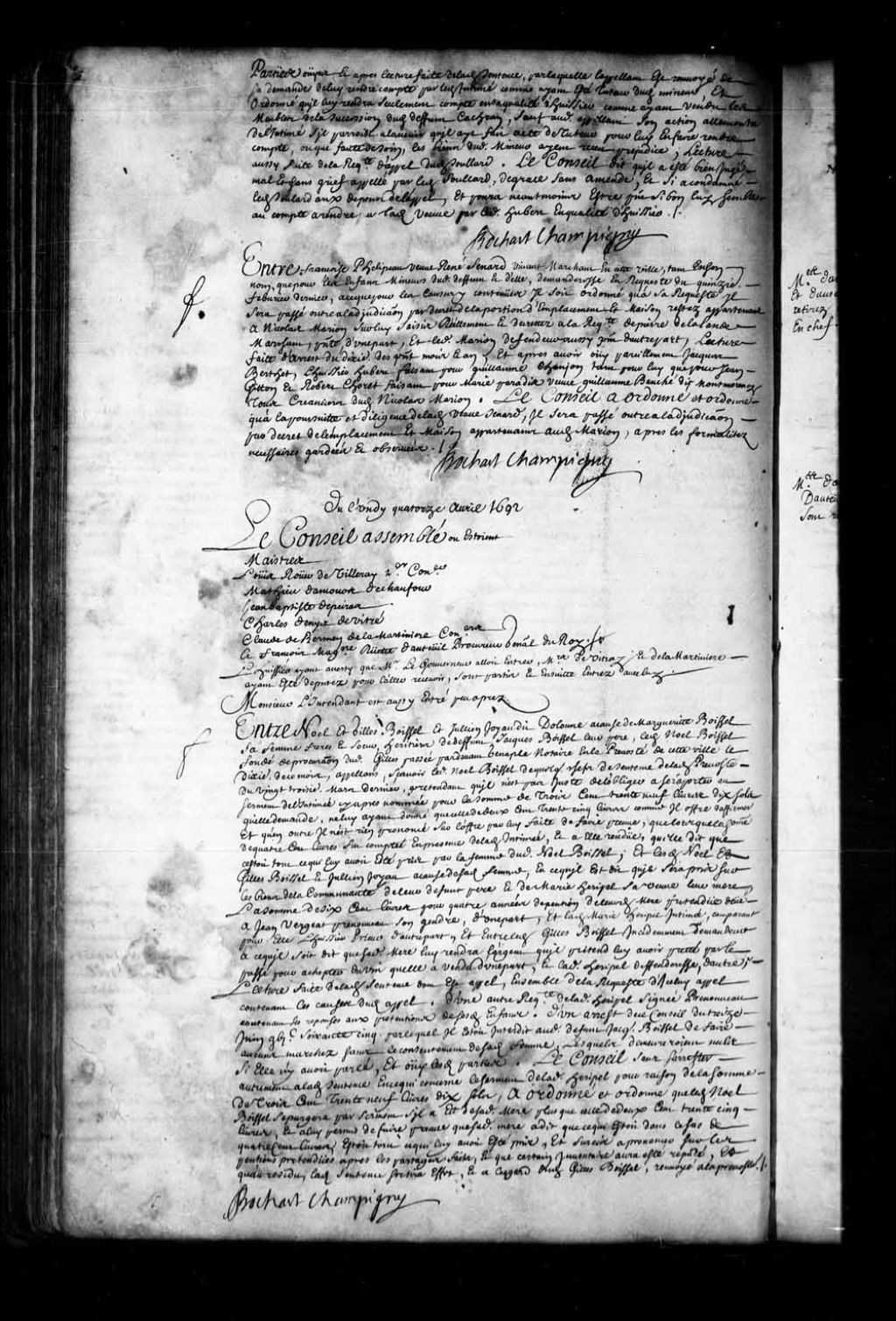 - Transcription du texte avec orthographe modernisée : «Du lundi quatorze avril 1692. Le Conseil assemblé où étaient Maîtres Louis Rouer de Villeray premier conseiller. Mathieu Damours Deschaufour. Jean-Baptiste Depeiras. Charles Denys de Vitré. Claude de Bermen de la Martinière conseillers. Et François Madeleine Ruette d'Auteuil procureur général du Roi. L'huissier ayant averti que Monsieur le gouverneur allait entrer, Messieurs de Vitray et de la Martinière ayant été députés pour l'aller recevoir, sont partis et ensuite entrés avec lui. Monsieur l'intendant est aussi entré peu après. Entre Noël et Gilles BOISSEL et Julien JOYAU dit DOLONNE à cause de Marguerite Boissel sa femme frères et soeur, héritiers de défunt Jacques Boissel leur père, ledit Noël Boissel fondé de procuration dudit Gilles passée par-devant Genaple notaire en la prévôté de cette ville le dixième de ce mois, appelant, savoir ledit Noël Boissel de quelques chefs de [...]