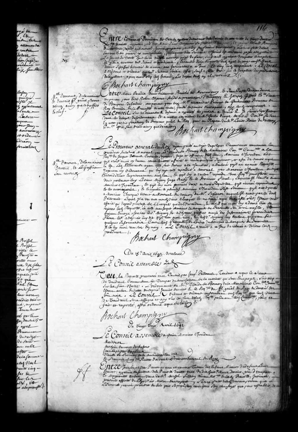 Renvoi à l'après-midi de la visite des procédures faites dans l'affaire de Jacques Pillereau contre les seigneurs, juges et officiers de Montréal, 14 avril 1692, Archives nationales à Québec, Fonds Conseil souverain, (03Q,TP1,S28,P4120).
