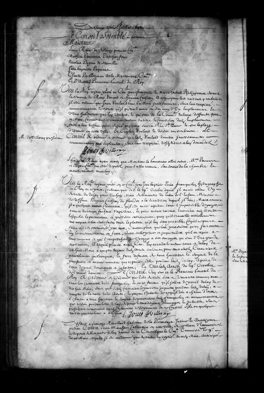 Arrêt ordonnant que l'arrêt du 29 octobre 1691 accordant un délai à Jean-Baptiste-Louis Franquelin, hydrographe du Roi, demeurera commun à tous les créanciers du dit Franquelin qui jouira d'un délai de dix-huit mois sans que ses créanciers ne puissent l'inquiéter durant ce délai, 21 juillet 1692, Archives nationales à Québec, Fonds Conseil souverain, (03Q,TP1,S28,P4174).