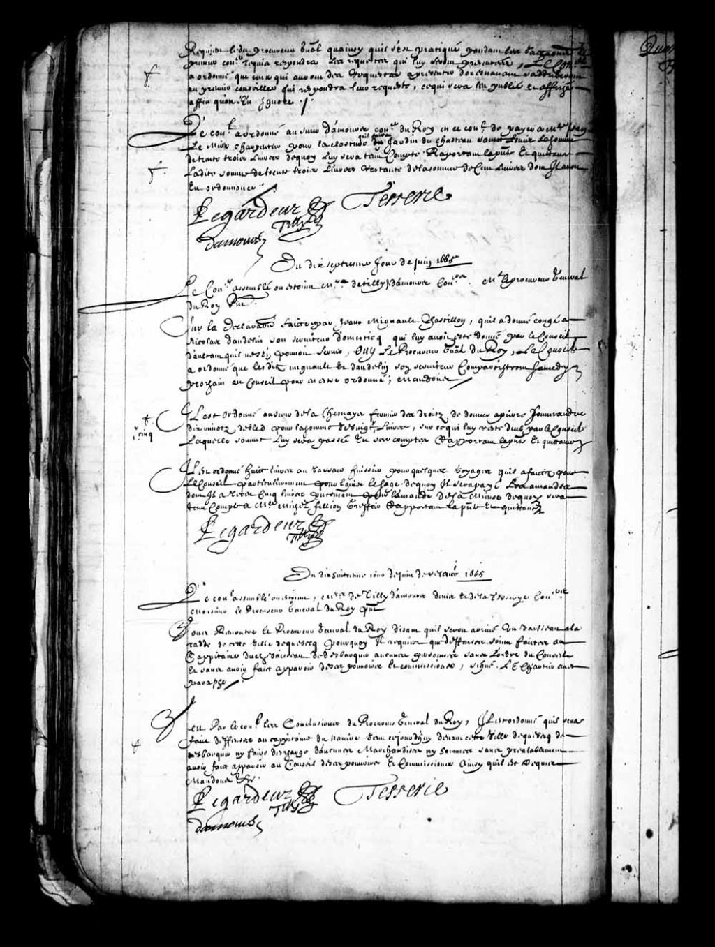 Transcription du texte avec orthographe modernisée : «Du dix-septième jour de juin 1665. Le Conseil assemblé où étaient Messieurs de Tilly et Damours conseillers Monsieur le procureur général du Roi présent sur la déclaration faite par Jean Mignault Chastillon qu'il a donné congé à Nicolas Daudelin son serviteur domestique qui lui avait été donné par le Conseil d'autant qu'il ne s'en pouvait servir, ouï le procureur général du Roi. Le Conseil a ordonné que lesdits Mignault et Daudelin son serviteur comparaîtront samedi prochain au Conseil pour en être ordonné mandons.»