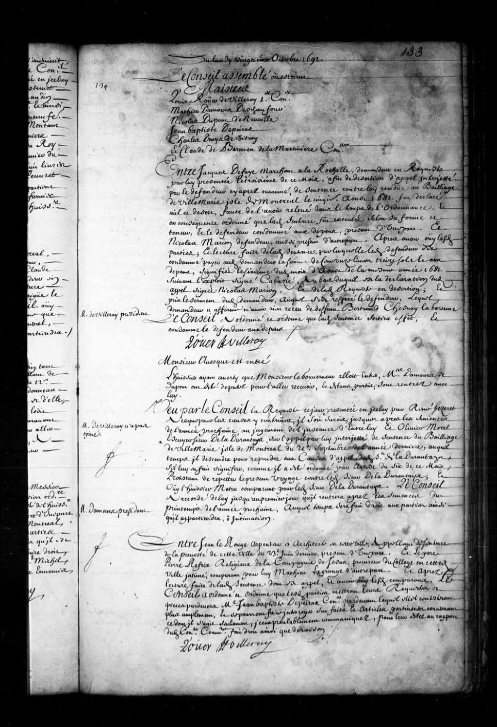 - Ordre aux parties, Jean Lerouge, arpenteur et architecte, et le père Pierre Raffeix, procureur du Collège des Jésuites à Québec, de mettre leurs requêtes et leurs pièces devant le sieur Jean-Baptiste de Peiras