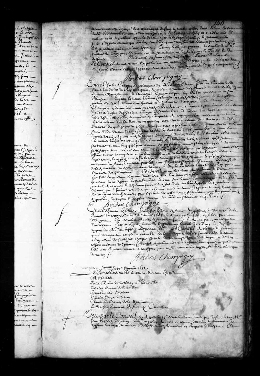 Transcription du texte avec orthographe modernisée : «Du 22e décembre 1692. Le Conseil assemblé où étaient Monsieur l'intendant Maîtres Louis Rouer de Villeray premier conseiller. Nicolas Dupont de Neuville. Jean-Baptiste Depeiras. Charles Denys de Vitray. Claude de Bermen de la Martinière. Et Mathieu Damours de Freneuse conseillers. Vu par le Conseil son arrêt du 17e novembre dernier rendu par défaut entre maître Jean-Baptiste Depeiras conseiller en icelui, au nom et comme exécuteur testamentaire de défunt Jean-Baptiste Gaudon (Godin) Bellefontaine, demandeur en requête d'une part. Et François Mingault marchand défendeur d'autre, portant que certaine sentence de la prévôté de cette ville du 29e juillet aussi dernier sera exécutée, et sur la demande portée par ladite requête que ledit mingault et sa femme soient condamnés par corps. Le Conseil de grâce aurait remis l'assignation au premier jour du présent mois, signification dudit arrêt audit mingault, avec assignation à ce jour par exploit du quinze de ce mois, signé Metru, et après que ledit sieur Depeiras a dit qu'il y a procès par-devant Monsieur l'intendant entre ledit mingault d'une part, et Charles de Couagne aussi marchand à Montréal d'autre part, et qu'il le supplie de le juger, ou de le remettre en ce Conseil pour le terminer, Monsieur l'intendant a dit qu'il remettra ledit procès en ce dit Conseil pour y être jugé. Le Conseil avant faire droit sur la contrainte par corps demandée par ladite requête a joint l'instance d'entre lesdits sieur Depeiras et mingault, et celle d'entre lesdits mingault et de Couagne, et en ce faisant a ordonné et ordonne que lesdits mingault et de Couagne comparaîtront à jour certain et compétent, pour être sur le tout fait droit aux dites parties ainsi que de raison. BOCHART CHAMPIGNY.»