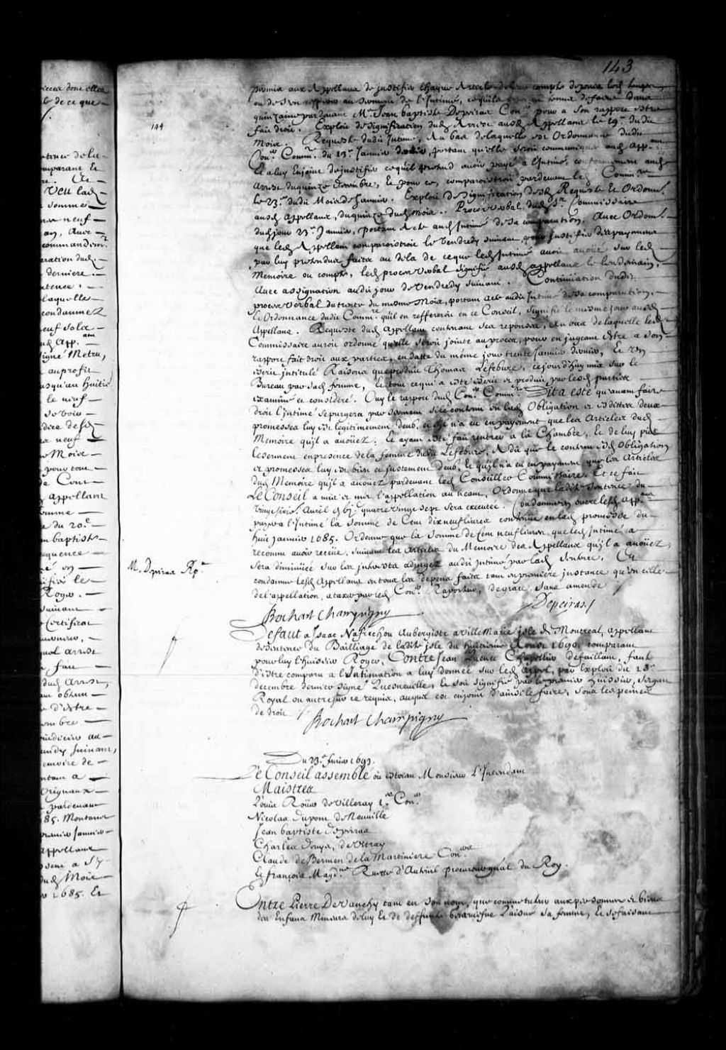 - Transcription du texte avec orthographe modernisée : «Du 23 février 1693. Le Conseil assemblé où étaient Monsieur l'intendant Maîtres Louis Rouer de Villeray premier conseiller. Nicolas Dupont de Neuville. Jean-Baptiste Depeiras. Charles Denys de Vitray. Claude de Bermen de la Martinière conseillers. Et François Madeleine Ruette d'Auteuil procureur général du Roi. Monsieur l'évêque est entré. Entre Pierre DE VANCHY tant en son nom, que comme tuteur aux personnes et biens des enfants mineurs de lui et de défunte Geneviève Laîné sa femme, et se faisant fort de Laurent Glory dit Labière, à cause de Françoise de Vanchy sa femme, l'une desdits mineurs, demandeur en entérinement de requête, répondue en ce Conseil le dernier juin 1692 d'une part. Et Jean-Baptiste Potier substitut du procureur fiscal au bailliage de Ville-Marie île de Montréal, défendeur d'autre part. Lecture faite d'arrêt rendu en ce Conseil sur ladite requête le sept juillet audit an, par lequel et pour les causes y contenues, lesdits mineurs sont restitués à l'encontre de sentences dudit bailliage, et permis à eux de faire assigner qui bon leur semblera à jour certain et compétent, au bas duquel est exploit de signification d'icelui et assignation au défendeur en date du 18e août, signé Pruneau. Défaut obtenu en ce Conseil par ledit de Vanchy à l'encontre dudit défendeur, faute de comparution à ladite assignation en date du 20e octobre ensuivant, signifié le onze décembre audit an, par exploit du même huissier. De défenses contre l'exposé en ladite requête, de répliques dudit demandeur aux dites défenses. Et de réponses aux dites répliques. De sentence rendue audit bailliage par maître Hilaire Bourgine procureur fiscal tenant le siège pour l'absence du bailli entre Pierre Cabazié au nom et comme procureur de Urbain Bouvier et Geneviève de Vanchy sa femme, et ledit de Vanchy le 24e octobre 1690 par laquelle il est dit entre autres choses que les meubles et immeubles seraient partagés, et en cas qu'ils ne le pussent être qu'ils seraient vendus à l'encan, et les immeubles par licitation, si mieux n'aimait ledit de Vanchy payer auxdits Bouvier et sa femme la part qui leur pouvait appartenir en la succession de ladite défunte Geneviève Laîné leur mère, sur le pied de la prisée en l'inventaire de requête dudit Cabazié audit nom, et ordonnance du quatre novembre audit an signée Bourgine, portant que ladite sentence du 24e octobre serait exécutée, et à ces fins les gardiens des meubles et bestiaux seraient tenus les représenter, ce faisant valablement déchargés, et à leur refus appelés au mardi suivant. De sentence rendue par le bailli dudit Montréal entre Jean-Baptiste de Celoron écuyer sieur de Blainville, et ledit de Vanchy le 21e novembre audit an. D'arrêt de ce Conseil du 26e février 1691 rendu entre ledit de Vanchy au nom qu'il procède, et ledit Urbain Bouvier, et des pièces y énoncées et datées produites par ledit de Vanchy, et entre autres les sentences dont il était appelant rendues par ledit Potier défendeur, et ouï lesdites parties, ensemble le procureur général du Roi en ses conclusions, le Conseil a déclaré et déclare ledit Potier avoir été follement pris à partie, et condamne ledit de Vanchy, en son nom, en ses dépens dommages et intérêts, desquels entreront ceux de ses voyage et séjour, à taxer par maître Louis Rouer de Villeray conseiller et de grâce sans amende, défenses audit de Vanchy de dire verbalement ni par écrit aucunes injures contre ledit Potier, sous telle peine que de raison. BOCHART CHAMPIGNY.»