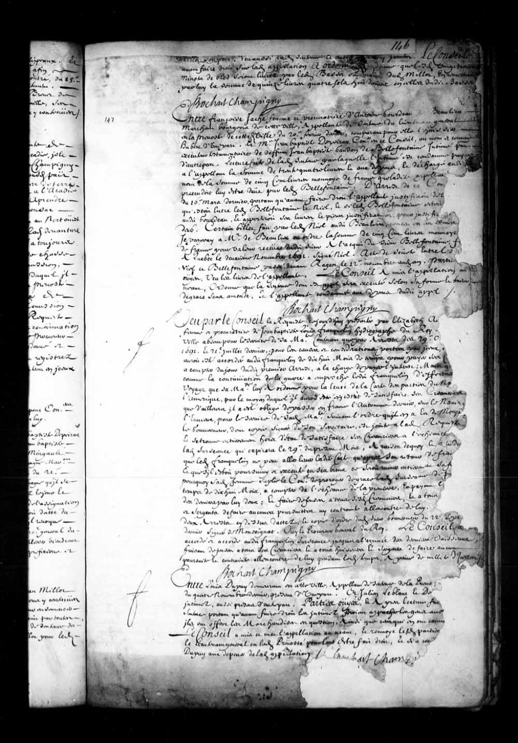 - Transcription du texte avec orthographe modernisée : «Vu par le Conseil la requête ce jourd'hui présentée par Elisabeth Aubert femme et procuratrice de Jean-Baptiste Louis Franquelin hydrographe du Roi en cette ville absent pour le service de sa Majesté contenant que par arrêts des 29e octobre 1691 et 21e juillet dernier, pour les causes et considérations portées par iceux, surséance aurait été accordée audit Franquelin de dix-huit mois de temps pour payer ses créanciers à compter du jour dudit premier arrêt, à la charge de payer l'intérêt; mais que comme la continuation de la guerre a empêché ledit Franquelin d'effectuer le voyage que sa Majesté lui a ordonné pour la levée de la carte des parties du nord de l'Amérique, par le moyen duquel il aurait été en état de satisfaire ses créanciers que d'ailleurs il a été obligé de passer en France l'automne dernier, sur le navire l'envieux, pour le service de sa dite Majesté suivant l'ordre qu'il en a eu de Monsieur le gouverneur, dont copie signée de son secrétaire, est jointe à ladite requête, et se trouve entièrement hors d'état de satisfaire ses créanciers à l'échéance de ladite surséance qui expirera le 29e du présent mois, à raison de quoi et attendu que ledit Franquelin ne peut aller lever ladite carte qu'après son retour de France, et que s'il était poursuivi et exécuté en ses biens ce serait ruiner entièrement sa femme, pourquoi sa dite femme supplie le Conseil de proroger de grâce ladite surséance de pareil temps de dix-huit mois, à compter de l'échéance de la première, en payant l'intérêt des deniers par lui dus; et faire défenses à tous sesdits créanciers, et à tous huissiers et sergents de faire aucunes poursuites ni contrainte à l'encontre de lui. copie desdits deux arrêts ci-dessus datés. Et copie d'ordre dudit sieur gouverneur du 22e septembre dernier signée de Monseignat. Ouï le procureur général du Roi. Le Conseil a accordé et accorde audit Franquelin surséance jusqu'à l'arrivée des derniers vaisseaux, faisant défenses à tous ses créanciers et à tous huissiers et sergents de faire aucune poursuite et contrainte à l'encontre de lui pendant ledit temps, à peine de nullité d'icelles. BOCHART CHAMPIGNY.»