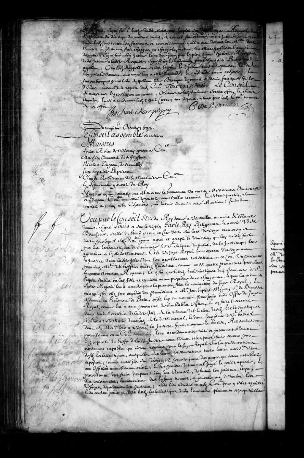 - Transcription du texte avec orthographe modernisée : «Vu par le Conseil l'édit du Roi donné à Versailles au mois de mars dernier, signé Louis et sur le repli par le Roi Phelippeaux, et à côté visa Boucherat, scellé du grand sceau en cire verte sur le laque de soie cramoisie et verte, par lequel sa Majesté ayant agréé et accepté la démission qui lui a été faite par les ecclésiastiques du séminaire de Saint-Sulpice de Paris, de la justice qui leur appartient en l'île de Montréal: crée un juge royal pour exercer dorénavant la justice dans ladite île, dont les appellations ressortiront en ce Conseil, un procureur pour sa dite Majesté un greffier, quatre huissiers, comme aussi quatre procureurs postulants et quatre notaires royaux; et afin que lesdits ecclésiastiques dudit séminaire de Saint-Sulpice établis en ladite île ne reçoivent aucun préjudice de ce changement, et pour les indemniser sa dite Majesté leur a accordé pour la première fois la nomination du juge royal, et qu'à cet effet elle fera expédier des provisions à maître Jean-Baptiste Migeon sieur de Branssat avocat au parlement de Paris, qu'ils lui ont nommé, pour jouir dudit office de juge royal, comme les autres pourvus de semblables offices, et en faire l'exercice dans toute l'étendue de ladite île, à la réserve de l'enclos desdits ecclésiastiques établis à Ville-Marie dans ladite île de Montréal, et dans leur ferme de Saint-Gabriel dont sa Majesté leur a réservé la justice haute, moyenne et basse, ressortissant pareillement en ce Conseil souverain, leur accordant a perpétuité et incommutablement la propriété du greffe de ladite justice nouvellement créé, pour le faire exercer par personnes capables qui seront reçues par le juge royal sur les présentations desdits ecclésiastiques, auxquelles sur leurs présentations toutes lettres nécessaires seront expédiées; comme aussi ils sont déchargés pour toujours des gages qui seront attribués aux officiers nouvellement créés, et de répondre de leur mal jugé et prise à partie, et pareillement des frais des poursuites des accusés, de fournir les prisons, le pain des prisonniers, la nourriture des enfants trouvés, et généralement de toutes les charges dépendant des justices; ledit édit adresse en ce dit Conseil pour y être registré et du contenu jouir et user lesdits ecclésiastiques dudit séminaire, pleinement et perpétuellement, conclusions du procureur général du Roi datés du jourd'hier. Ouï le rapport de maître Louis Rouer de Villeray premier conseiller. Le Conseil a ordonné et ordonne que ledit édit sera lu, publié et registre au greffe d'icelui, pour être exécuté en tout son contenu selon sa forme et teneur, et afin qu'il soit notoire en ladite juridiction de Montréal, qu'il y sera aussi lu, publié l'audience tenant et registré au greffe de ladite juridiction royale de Montréal lorsqu'elle sera établie, à ce que chacun à son égard ait à l'exécuter, ainsi qu'il appartiendra. Monsieur de Villeray rapporteur. BOCHART CHAMPIGNY ROUER DE VILLERAY.»