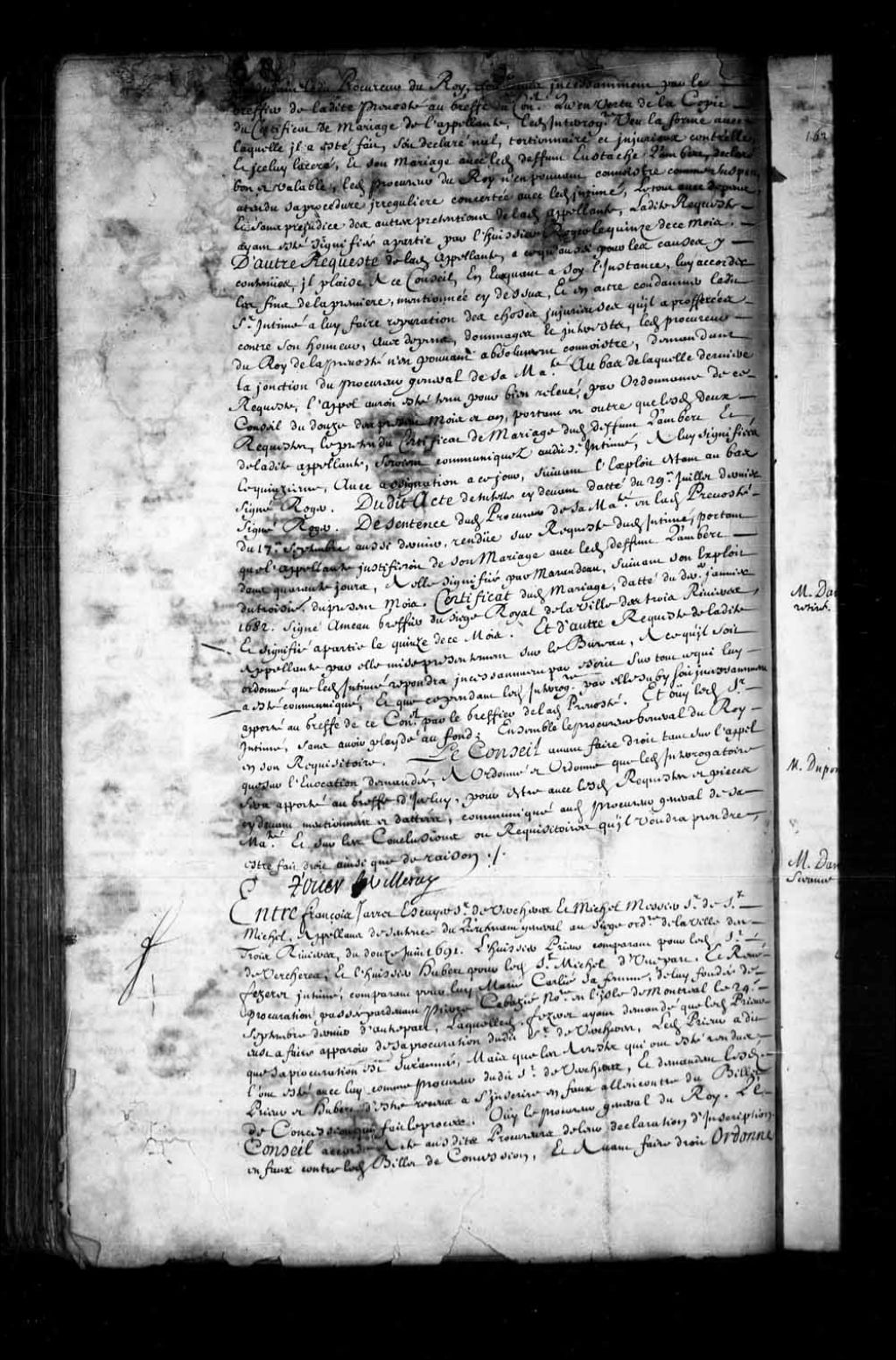 - Transcription du texte avec orthographe modernisée : «Entre François JARRET écuyer sieur de VERCHERES et Michel MESSIER sieur de Saint-Michel, appelant de sentence du lieutenant général au siège ordinaire de la ville des Trois-Rivières, du douze juin 1691. l'huissier Prieur comparant pour ledit sieur de Verchères, et l'huissier Hubert pour ledit Saint-Michel d'une part. Et René FEZERET intimé, comparant pour lui Marie Carlié sa femme, de lui fondée de procuration passée par-devant Pierre Cabazié notaire en l'île de Montréal le 24e septembre dernier d'autre part, laquelle dite Fezeret ayant demandé que ledit Prieur eût à faire apparaître de sa procuration dudit sieur de Verchères, ledit Prieur a dit que sa procuration est surannée, mais que les arrêts qui ont été rendus l'ont été avec lui comme procureur dudit sieur de Verchères, et demandent lesdits Prieur et Hubert d'être reçus a s'inscrire en faux à l'encontre du billet de concession qui fait le procès. Ouï le procureur général du Roi. Le Conseil accorde acte auxdits procureurs de leur déclaration d'inscription en faux contre ledit billet de concession, et avant faire droit ordonne que lesdits procureurs seront tenus de consigner au greffe d'icelui la somme de cent livres, et responsables de l'événement en leur propre et privé nom, laquelle consignation sera par eux faite dans vingt-quatre heures, attendu qu'ils ont déclaré n'avoir de procuration spéciale, et à faute de consigner par eux dans ledit temps, sera passé outre au jugement du procès, et à ces fins ledit Conseil appointe les parties à écrire et produire tout ce que bon leur semblera, pour au rapport de maître Charles Denys de Vitray leur être fait droit ainsi que de raison. ROUER DE VILLERAY.»