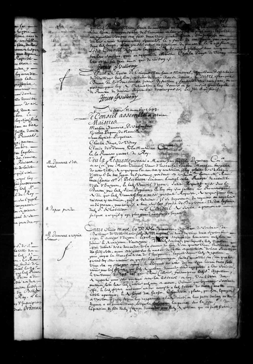 - Transcription du texte avec orthographe modernisée : «Monsieur Damours a repris séance. Entre Olivier MOREL écuyer sieur de LADURANTAYE, appelant de sentence du bailliage de Ville-Marie île de Montréal en date du vingt-deux septembre 1691. Et anticipé d'une part. Et René FEZERET arquebusier demeurant audit lieu intimé et anticipant d'autre part. Vu ladite sentence, par laquelle ledit appelant était débouté de sa demande de la somme de huit cent quatre-vingt et une livres dix-huit sols, ayant été prise sur la masse du castor et pelleteries de leur société, pour payer les marchandises de l'équipement, laquelle somme ledit appelant prétend lui être revenue en profit lors des partages faits l'année mille six cent quatre-vingt-six ni être pas entrée, et à l'égard de celle de cent sept livres trois sols, reçue par ledit Fezeret, que ledit appelant demande être rapportée à leur société, et une somme de 299 livres 14 sols que René Cullerié (Cuillerier), faisant pour ledit sieur appelant, a rapportée pour être partagée entre les associés et lui, vu l'état des partages faits entre ledit Cullerié audit nom, et autres, ordonne que le partage sortirait effet, et ledit Fezeret condamné rendre compte à ladite société de trois canots restés à partager; et à l'égard des haches, chaudières, plats, poche, éponges et voiles, qu'icelui Fezeret les rapporterait à ladite société, ou leur juste valeur au dire de gens à ce connaissant, lesquels régleraient les parties sur la demande de la pension du fils dudit Fezeret demandée par ledit appelant qui en justifierait, lequel remettrait audit Fezeret sa promesse de deux cents livres du trois août 1685 pour le dédommagement du nommé Huguet, comme payée, suivant les acquits dudit appelant, l'un à Chicagou (Chicago) le 17e mai 1686 par lequel il promet déduire audit Fezeret cent francs en cas que les avances dudit Huguet fussent sur la facture, ce qui se trouve justifié par icelle, et l'autre de cent livres, du 2e août 1688. à la charge par ledit intimé de payer à l'appelant cinquante livres en castor à lui revenant du rapport desdites cents livres payées sur leur dite société pour ledit Huguet, si mieux ledit appelant estimait les déduire sur le canot que ledit intimé lui avait envoyé à Lachine, lequeldit appelant est condamné payer ledit canot à dire de gens à ce connaissant, si mieux l'intimé n'estimait recevoir quatre-vingt livres offertes par l'appelant. Et à l'égard de ses demandes contre les nommés Rochereau, Pilotte et Beaudet, ou autres ayant cause, attendu qu'ils n'avaient pas été appelés, ordonné qu'il se pourvoirait ainsi qu'il aviserait bon être, ainsi que pour son recours, et ledit sieur appelant condamné aux dépens, taxés à dix-neuf livres dix sols. Vu aussi les pièces datées par ladite sentence, et celles produites en outre par ledit appelant; savoir sa requête d'appel de ladite sentence, répondue le 28e août de l'année dernière, et signifiée audit intimé le troisième septembre ensuivant, et à Jean Pilotte le 23e dudit mois, avec assignation à eux donnée en ce Conseil. billet dudit Pilote dudit jour 23e septembre de la même année, par lequel il élit son domicile à la maison de Michel LeMarié à la basse-ville au cul-de-sac. Arrêt de ce Conseil du 20e octobre audit an rendu sur requête de l'intimé, portant délai à lui accordé jusqu'après les semences. Autre arrêt du dernier juin dernier passé, portant que ledit Fezeret et autres intéressés viendraient en personne, pour être ouïs par leurs bouches, au premier jour d'après les vacances des récoltes, signifié les onze août et troisième septembre aux dit Fezeret et François Rochereau. Déclaration dudit Rochereau du 15e du même mois de septembre, qu'il est descendu en 1686 trente-trois paquets de castor de la société d'entre ledit sieur appelant et de Fezeret, pilote, Laurent Baudet et lui dit Rochereau, dont il lui était revenu quatre-vingt-seize livres de castor d'une part et cent trente-quatre livres en argent d'autre de profit en ladite année, et qu'en 1689 il descendit avec un Sauvage nommé Le Rat vingt-trois paquets de castor appartenant à ladite société, et que lesdites quatre-vingt-seize livres ont été payées à son acquit au sieur Hazeur, et que des 23 paquets il y en avait un de gras. Interrogatoire fait sur faits et articles par Monsieur l'intendant étant à Montréal audit Fezeret le 17e dudit mois de septembre dernier. Déclaration dudit Cullerié faite par-devant mondit sieur l'intendant le même jour. Arrêt de ce Conseil du douze octobre dernier, portant appointement à écrire et produire par lesdites parties tout ce que bon leur semblerait, bailler contredits et salvations, et permis à l'appelant de faire interroger sur faits et articles tels des intimés que bon lui semblerait autre que ledit Fezeret, et si besoin était de faire ouïr témoins par enquête, par-devant maître Jean-Baptiste Depeiras conseiller pour à son rapport être fait droit ainsi que de raison, signifié audit Fezeret le 21e dudit mois et audit Pilote le 24e ensuivant. Interrogatoire sur faits et articles, par ledit conseiller commissaire audit Pilote le 16e dudit mois, signifié audit Fezeret le 21e. Requête dudit sieur appelant, au bas de laquelle est ordonnance dudit conseiller commissaire dudit jour 16e portant que la requête serait communiquée, et cependant permis de faire assigner ledit le Rat pour être ouï, signifiée à partie le 21e dudit mois d'octobre. enquête du 19e contenant l'audition dudit le Rat, signifiée à partie ledit jour 21e pièces produites par l'intimé, savoir sept certificats, en date des 5. 7. Et 11e d'octobre 1691. missive écrite de La Rochelle le dix mai de l'année dernière audit intimé, signée Bourgine. Arrêt du 6e octobre de ladite année dernière, portant que lesdites parties en viendraient au lundi suivant, et que l'appelant comm