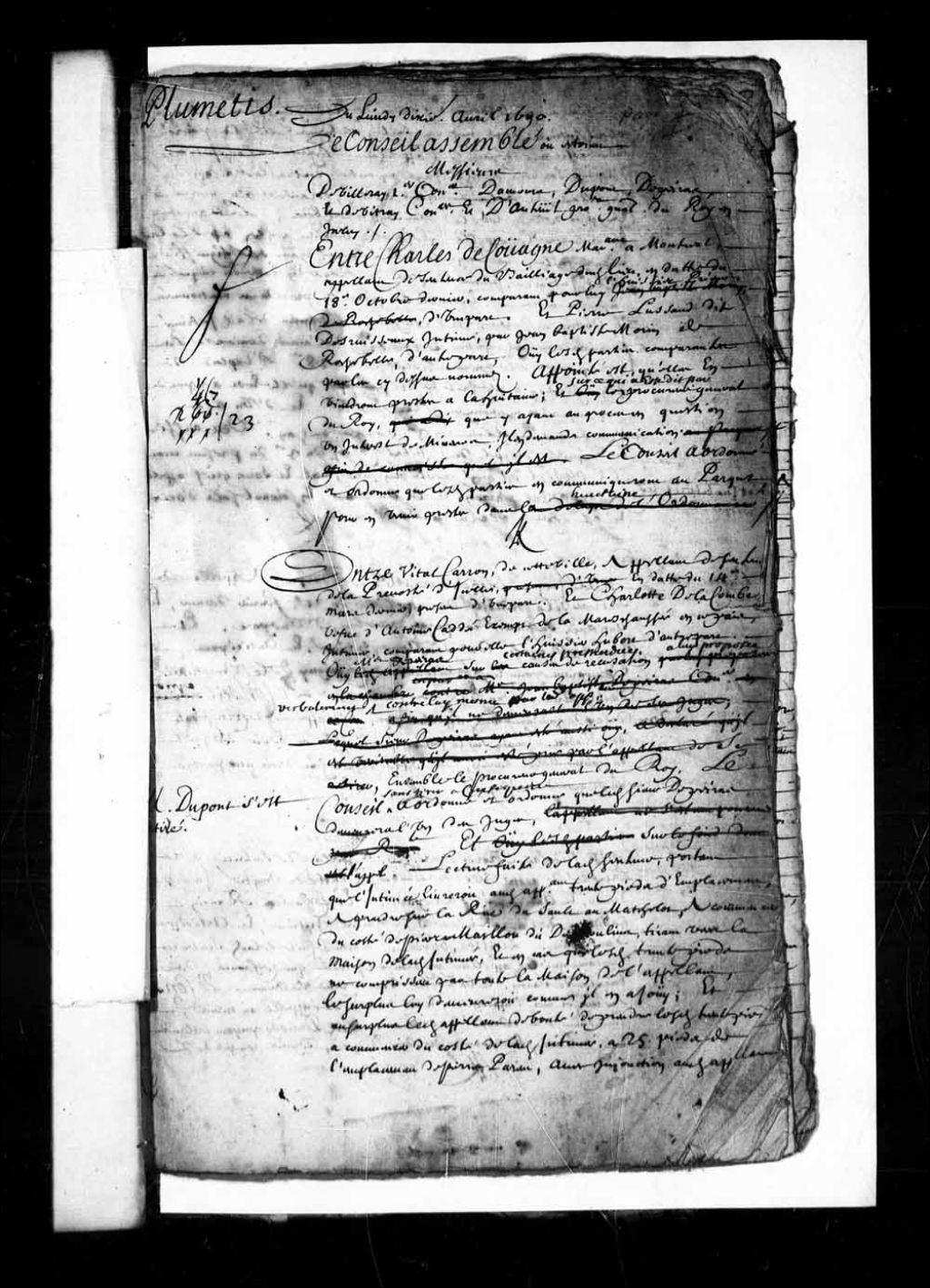 - Transcription du texte avec orthographe modernisée : «Du lundi dixième avril 1690. Le Conseil assemblé où étaient Maîtres Louis Rouer de Villeray premier conseiller. Mathieu Damours Deschaufour. Nicolas Dupont de Neuville. Jean-Baptiste Depeiras. Et Charles Denys de Vitré conseillers. Et François Madeleine Ruette d'Auteuil procureur général du Roi. Entre Charles de COUAGNE marchand à Montréal, appelant de sentence du bailliage dudit lieu en date du dix-huit octobre dernier, comparant pour lui l'huissier Prieur d'une part, et Pierre LUSSAUD dit DESRUISSEAUX intimé comparant pour lui Jean-Baptiste Morin de Rochebelle d'autre part, ouï lesdites parties comparantes par les ci-dessus nommés. appointé est, qu'elles en viendront prêtes à la huitaine, et sur ce qui a été dit par le procureur général du Roi que y ayant au procès en question un intérêt de mineurs, il en demande communication. Le Conseil a ordonné et ordonne que lesdites parties [...]