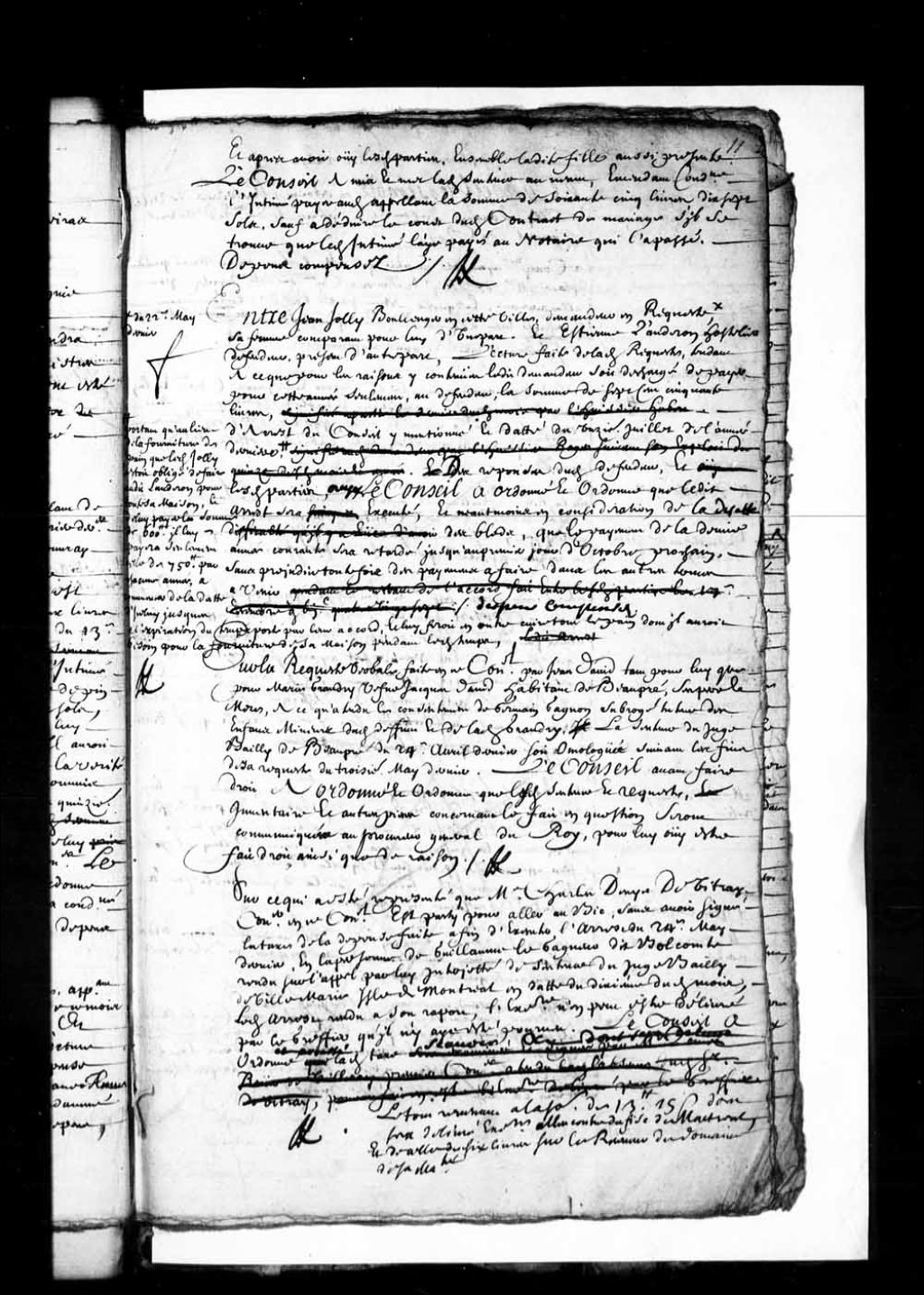 Transcription du texte avec orthographe modernisée : «Sur ce qui a été représenté que maître Charles Denys de Vitray conseiller en ce Conseil est parti pour aller au Bic sans avoir signé la taxe de la dépense faite afin d'exécuter l'arrêt du vingt-quatrième mai dernier en la personne de Guillaume le Gagneur dit Bolcomte rendu sur l'appel par lui interjeté de sentence du juge bailli de Ville-Marie île de Montréal en date du dixième dudit mois, ledit arrêt rendu à son rapport, l'exécutoire n'en peut-être délivré par le greffier qu'il n'y ait été pourvu. Le Conseil a ordonné et arrêté ladite taxe, savoir à Marandeau, Metru, Marquis et Prieur huissiers pour avoir été prendre aux prisons ledit Bolcomte, conduit au palais afin d'être interrogé à la chambre, et icelui reconduit lesdites prisons, a chacun quarante-cinq sols pour une demi journée, neuf livres, cy 9 livres, A Laverdure et Coeurbal archers pour avoir escorté chacun, quarante sols [...]