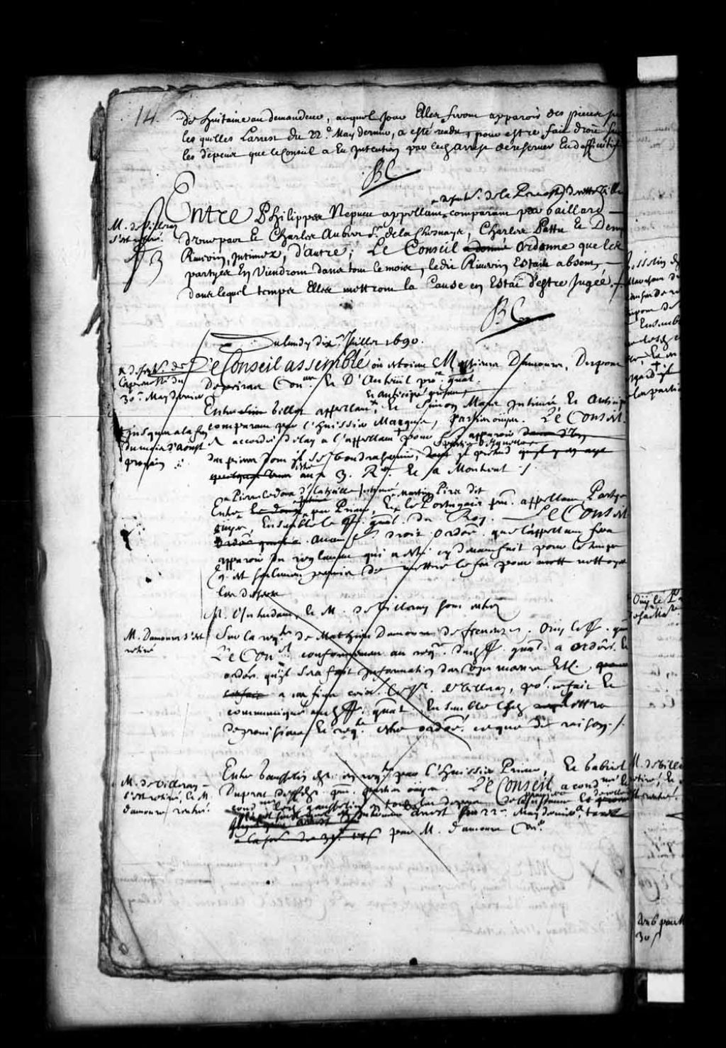 Transcription du texte avec orthographe modernisée : «Du lundi dixième juillet 1690. Le Conseil assemblé où étaient Maîtres Mathieu Damours, Deschaufour. Nicolas Dupont, de Neuville. Jean-Baptiste Depeiras conseillers. Et François Madeleine Ruette d'Auteuil procureur général du Roi. Entre Louis GILLET appelant de sentence de la prévôté de cette ville en date du trentième mai dernier, et anticipé présent d'une part. Et Simon Mars intimé et anticipant, comparant pour lui l'huissier Marquis d'autre part. Parties ouïes, le Conseil a accordé délai audit appelant jusqu'à la fin du mois d'août prochain, pour faire apparaître des pièces dont il entend se servir, partie desquelles il prétend être aux Trois-Rivières et à Montréal. Monsieur Damours président.»