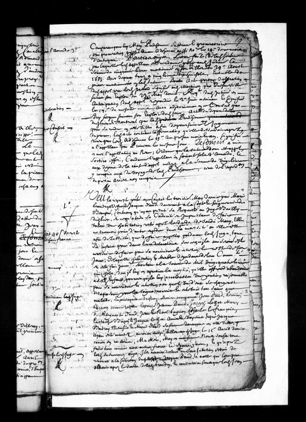 - Transcription du texte avec orthographe modernisée : «Vu la requête présentée en ce Conseil le troisième mai dernier par Marie Grandry veuve de Jacques David demeurante à la côte et seigneurie de Beaupré, contenant qu'ayant présenté sa requête au juge bailli dudit lieu à ce qu'attendu sa caducité et impuissance de faire valoir une habitation restée après le décès de sondit mari, elle ne trouvait point d'autre expédient dans la nécessité ou elle est afin de subsister, que de faire appeler par-devant ledit juge tous ses enfants pour donner leurs déclarations sur ce qu'ils aviseraient être nécessaire de faire pour sa nourriture et entretien le reste de ses jours de laquelle habitation et meubles dépendant de leur communauté a été fait inventaire montant à la somme de mille vingt-quatre livres quinze sols dont il lui en appartient la moitié qu'elle offrait d'abandonner à sesdits enfants pourvu qu'ils lui accordassent une pension raisonnable pour sa nourriture et entretien, ou que l'un deux se chargeât de sa personne pour la soigner, nourrir et entretenir tant saine que malade, en conséquence de quoi seraient comparus par-devant ce dit juge Jean David, Germain Gagnon comme ayant épousé Jeanne David. Joseph Lesot mari de Marguerite David, Jean et Noël Gagnon, Charles LeFrançois, Eustache Bascon, et Jacques Lesot amis et voisins, et que Jacques Boutray menuisier et Marie David sa femme demeurant en cette ville ayant été mandés auraient envoyé billet audit juge le quinzième avril dernier conçu en ces termes, ma mère, moi et ma femme nous souhaitons faire tout comme nos autres frères et soeurs feront, et qu'après lesdits sus-nommés ouïs, Ils auraient déclaré par-devant ledit juge que leur intention était de renoncer à la succession dudit défunt Jacques David et à celle qui leur peut venir après le décès de ladite Grandry et consentaient tous que ledit Jean David fît son propre des meubles et immeubles de ladite communauté moyennant qu'il nourrît et entretint leur dite mère et lui donnât tout ce qui serait nécessaire tant saine que malade, selon ses offres, sur quoi ledit juge aurait par sentence du vingt-quatre avril dernier ordonné que ledit Jean David jouirait à l'avenir desdits meubles et immeubles, aux charges portées par icelle, entre autres que Anne David mineure de seize à dix-sept ans serait nourrie et entretenue selon sa condition jusqu'à ce qu'elle soit pourvue par mariage ou autrement, mais que comme lesdits Joseph Lesot et Marguerite David sa femme n'étant âgés que de chacun vingt-trois ans Ils n'ont pu valablement consentir, et que la femme dudit Germain Gagnon étant aussi mineure aussi bien que Jacques David et ladite Anne David qui pourraient aussi demander leurs droits en la succession de leur père quoi qu'obligés à ladite nourriture et entretien, et conclu à ce que pour éviter à tous différent à l'avenir ladite sentence du bailli de Beaupré fut homologuée en ce Conseil, et ledit Jean David autorisé en la possession en la moitié de ladite habitation et des meubles inventoriés sans aucune recherche par ladite Grandry et tous autres, et que l'autre moitié appartenant auxdits enfants contribue chacun pour leur part et portion à la somme de deux cents livres pour la pension de ladite Grandry leur mère, et de ladite Anne David leur soeur, si mieux aucun deux n'estime s'en charger au même prix, pour lequel ledit Jean David offre de contribuer de sa part, ou qu'ils aient à recevoir de lui lors qu'ils seront en âge chacun la somme de quatre-vingt livres qui leur revient en la moitié audit inventaire et l'en laisser jouir jusqu'audit temps. Lecture faite de ladite sentence du vingt-quatrième avril dernier. D'arrêt rendu sur ladite requête ledit jour troisième mai, portant qu'il serait fait assemblée de parents et amis desdits mineurs pour procéder à l'élection d'un subrogé tuteur, pour ladite requête lui être communiquée et lui ouï, être fait droit sur les fins d'icelle. De procès-verbal de ladite assemblée de parents et amis par-devant ledit conseiller commissaire en date du dixième juin dernier, par lequel il paraît que ledit Germain Gagnon a été nommé pour subrogé tuteur desdits mineurs. Et ouï lesdits Jean David et Germain Gagnon ledit David ayant demandé l'entérinement de ladite requête présentée par sa dite mère en ce Conseil ledit jour troisième mai, et ledit Germain Gagnon dit qu'après avoir tout vu et bien considéré, que le bien resté après le décès dudit Jacques David n'étant pas capable de payer pension à ladite Marie Grandry sa veuve, il est plus à propos et consent que ledit bien reste et demeure en propre audit Jean David, à la charge comme dit est de nourrir et entretenir sa dite mère le reste de ses jours, et de payer aux autres héritiers ce qui leur en appartient suivant l'inventaire, attendu que s'il fallait payer pension pour ladite Marie Grandry il ne resterait possible rien auxdits mineurs, ouï sur ce le procureur général du Roi. Le Conseil ayant aucunement égard à ladite sentence du vingt-quatrième avril dernier, au consentement des parents et amis y mentionné, et à celui de Germain Gagnon subrogé tuteur, a ordonné et ordonne que ledit Jean David demeurera propriétaire d'une habitation sise à la côte de Beaupré contenant deux arpents de front sur une lieue et demie de profondeur, ainsi que des bâtiments qui en dépendent, et que le tout se poursuit et comporte, ensemble des meubles contenus en l'inventaire qui en fut fait le dix-neuf août 1686 pour en jouir par lui ses héritiers et ayant cause a perpétuité, à la charge de nourrir, loger et entretenir sa dite mère le reste de ses jours tant saine que malade, et après son décès de la faire inhumer, et faire prier Dieu pour le repos de son âme; et même de nourrir et entretenir ladite Anne David jusqu'à ce qu'elle soit pourvue par mariage au autrement, et de pa