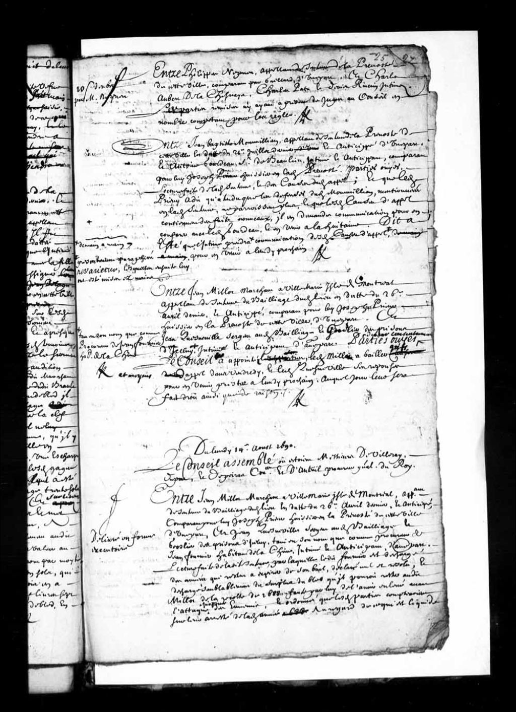 Transcription du texte avec orthographe modernisée : «Du lundi quatorzième août 1690. Le Conseil assemblé où étaient Maîtres Louis Rouer de Villeray premier conseiller. Nicolas Dupont de Neuville. Et Jean-Baptiste Depeiras conseillers. Et François Madeleine Ruette d'Auteuil procureur général du Roi. Entre Jean MILLOT marchand à Ville-Marie île de Montréal, appelant de sentence du bailliage dudit lieu en date du vingt-six avril dernier, et anticipé, comparant pour lui Joseph Prieur huissier en ladite prévôté de cette ville, d'une part, et Jean QUESNEVILLE sergent audit bailliage et geôlier des prisons d'icelui, tant en son nom, que comme procureur de Jean Fournier habitant de Lachine, intimé, et anticipant, d'autre part, lecture faite de ladite sentence par laquelle ledit Fournier est déchargé des années qui restent à expirer de son bail, déclaré nul et résolu, et déchargé semblablement du surplus du blé qu'il pourrait rester audit [...]
